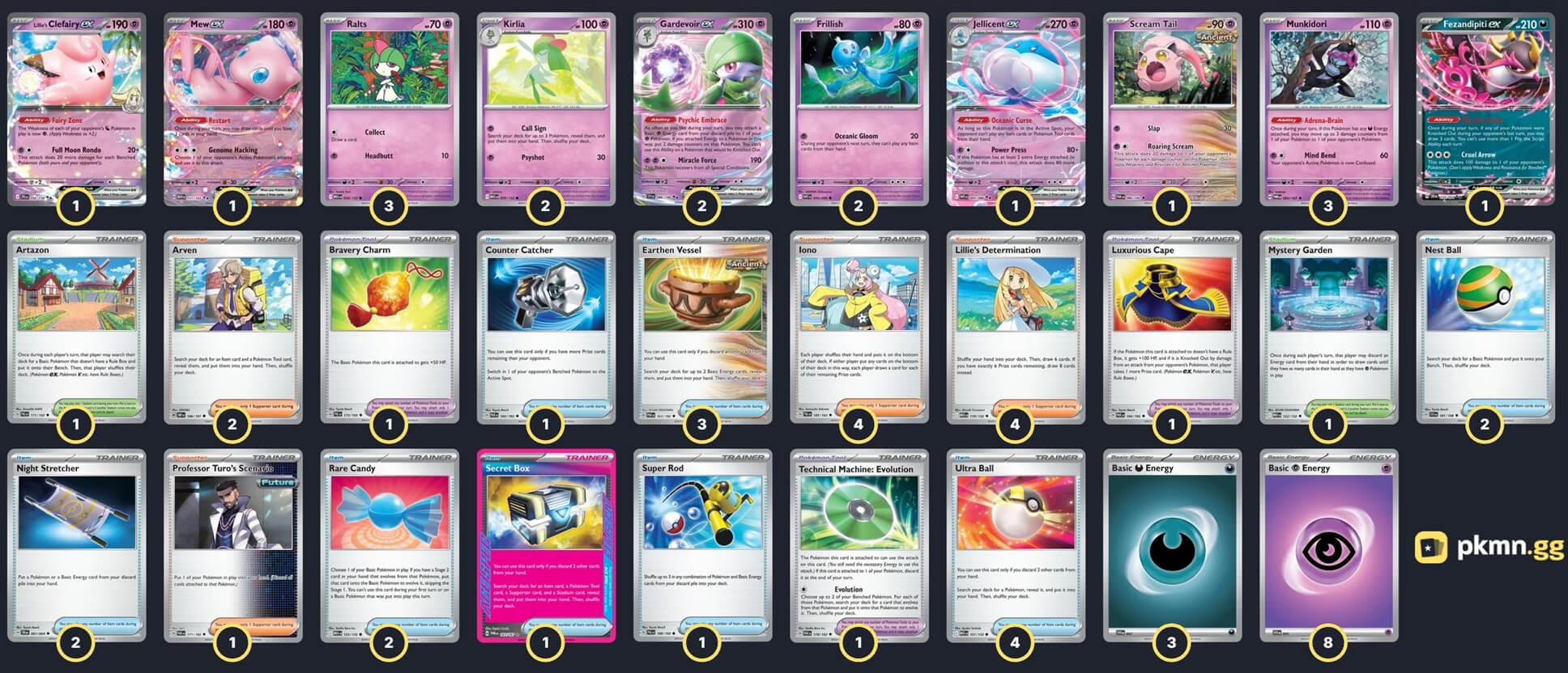 Pokémon: 17 3 Ralts MEG 58 2 Kirlia MEG 59 2 Gardevoir ex SVI 86 3 Munkidori TWM 95 2 Frillish WHT 44 1 Jellicent ex WHT 45 1 Scream Tail PAR 86 1 Lillie's Clefairy ex JTG 56 1 Fezandipiti ex SFA 38 1 Mew ex MEW 151 Trainer: 32 4 Lillie's Determination MEG 119 4 Iono PAL 185 2 Arven OBF 186 1 Professor Turo's Scenario PAR 171 4 Ultra Ball MEG 131 3 Earthen Vessel PAR 163 2 Rare Candy MEG 125 2 Nest Ball SVI 181 2 Night Stretcher SFA 61 1 Secret Box TWM 163 1 Counter Catcher PAR 160 1 Super Rod PAL 188 1 Technical Machine: Evolution PAR 178 1 Luxurious Cape PAR 166 1 Bravery Charm PAL 173 1 Artazon PAL 171 1 Mystery Garden MEG 122 Energy: 11 8 Psychic Energy MEE 5 3 Darkness Energy MEE 7 |