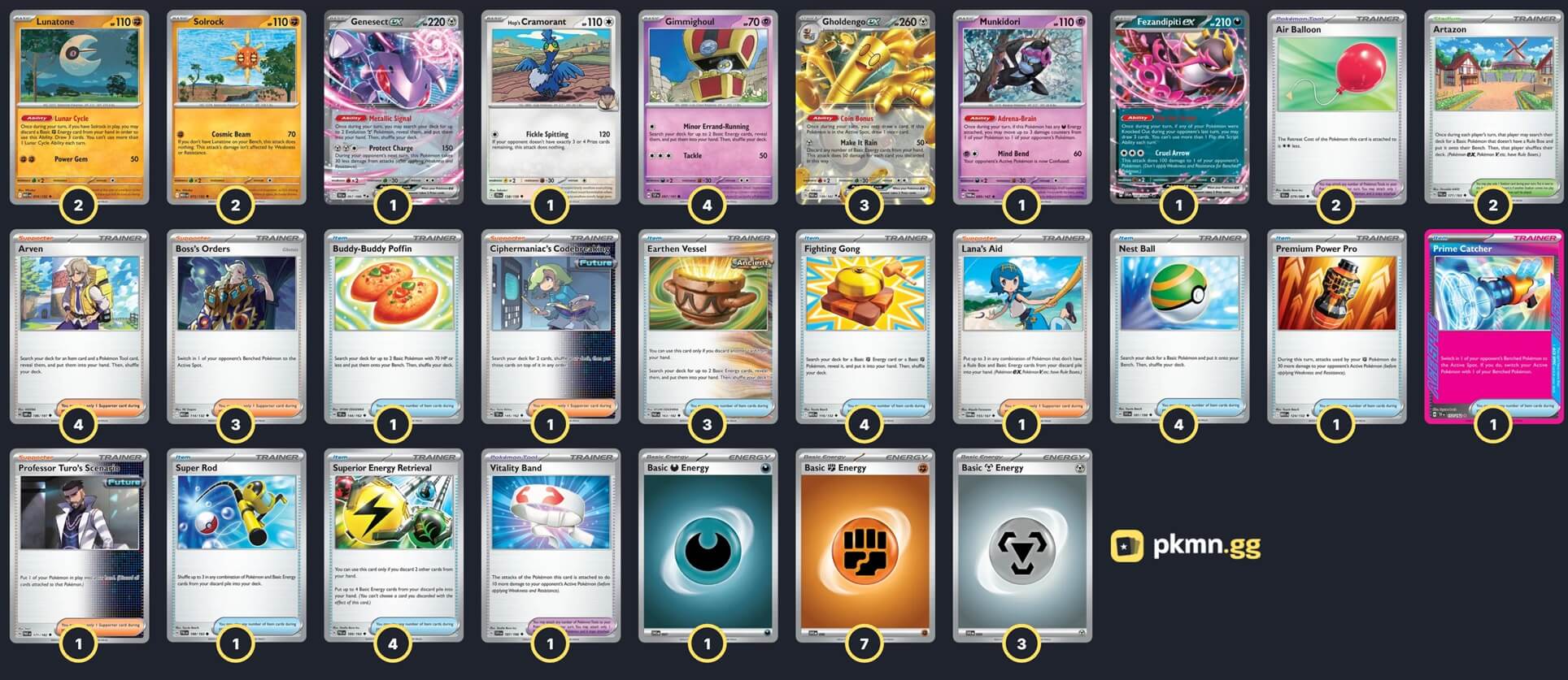 Pokémon: 15 4 Gimmighoul SSP 97 3 Gholdengo ex PAR 139 2 Solrock MEG 75 2 Lunatone MEG 74 1 Hop's Cramorant JTG 138 1 Munkidori TWM 95 1 Genesect ex BLK 67 1 Fezandipiti ex SFA 38 Trainer: 34 4 Arven OBF 186 3 Boss's Orders MEG 114 1 Ciphermaniac's Codebreaking TEF 145 1 Lana's Aid TWM 155 1 Professor Turo's Scenario PAR 171 4 Nest Ball SVI 181 4 Fighting Gong MEG 116 4 Superior Energy Retrieval PAL 189 3 Earthen Vessel PAR 163 1 Buddy-Buddy Poffin TEF 144 1 Super Rod PAL 188 1 Premium Power Pro MEG 124 1 Prime Catcher TEF 157 2 Air Balloon BLK 79 1 Vitality Band SVI 197 2 Artazon PAL 171 Energy: 11 7 Fighting Energy MEE 6 3 Metal Energy MEE 8 1 Darkness Energy MEE 7 |