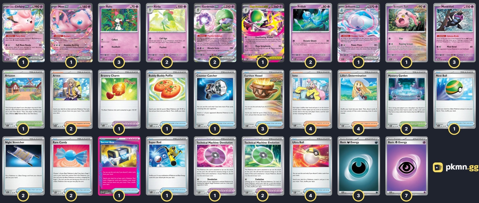 Pokémon: 17 3 Ralts MEG 58 2 Kirlia MEG 59 2 Gardevoir ex SVI 86 1 Mega Gardevoir ex MEG 60 3 Munkidori TWM 95 2 Frillish WHT 44 1 Jellicent ex WHT 45 1 Lillie's Clefairy ex JTG 56 1 Scream Tail PAR 86 1 Mew ex MEW 151 Trainer: 33 4 Iono PAL 185 4 Lillie's Determination MEG 119 2 Arven OBF 186 4 Ultra Ball MEG 131 3 Earthen Vessel PAR 163 2 Rare Candy MEG 125 2 Night Stretcher SFA 61 1 Buddy-Buddy Poffin TEF 144 1 Nest Ball SVI 181 1 Counter Catcher PAR 160 1 Super Rod PAL 188 1 Secret Box TWM 163 2 Technical Machine: Evolution PAR 178 1 Technical Machine: Devolution PAR 177 1 Bravery Charm PAL 173 2 Mystery Garden MEG 122 1 Artazon PAL 171 Energy: 10 7 Psychic Energy SVE 21 3 Darkness Energy SVE 23 |