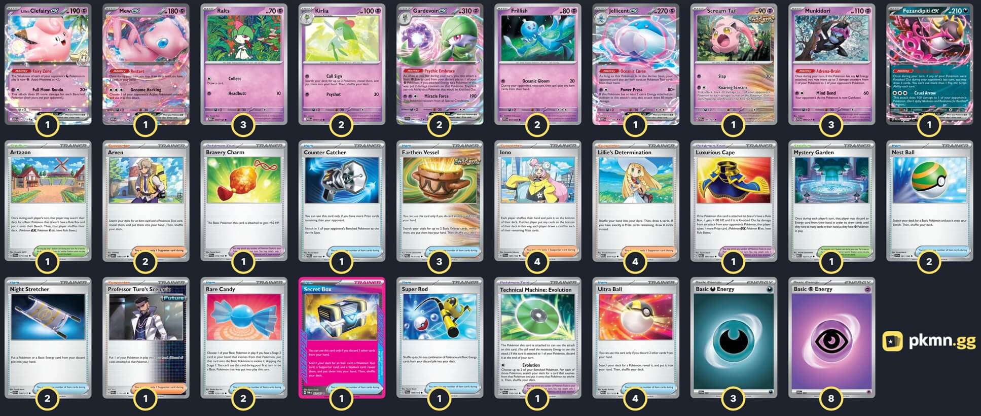 Pokémon: 17 3 Ralts MEG 58 2 Kirlia MEG 59 2 Gardevoir ex SVI 86 3 Munkidori ASC 99 2 Frillish WHT 44 1 Jellicent ex WHT 45 1 Scream Tail PAR 86 1 Lillie's Clefairy ex ASC 76 1 Fezandipiti ex ASC 142 1 Mew ex MEW 151 Trainer: 32 4 Lillie's Determination MEG 119 4 Iono PAL 185 2 Arven OBF 186 1 Professor Turo's Scenario PAR 171 4 Ultra Ball MEG 131 3 Earthen Vessel PAR 163 2 Rare Candy MEG 125 2 Nest Ball SVI 181 2 Night Stretcher ASC 196 1 Secret Box TWM 163 1 Counter Catcher PAR 160 1 Super Rod PAL 188 1 Technical Machine: Evolution PAR 178 1 Luxurious Cape PAR 166 1 Bravery Charm PAL 173 1 Artazon PAL 171 1 Mystery Garden MEG 122 Energy: 11 8 Psychic Energy MEE 5 3 Darkness Energy MEE 7 |