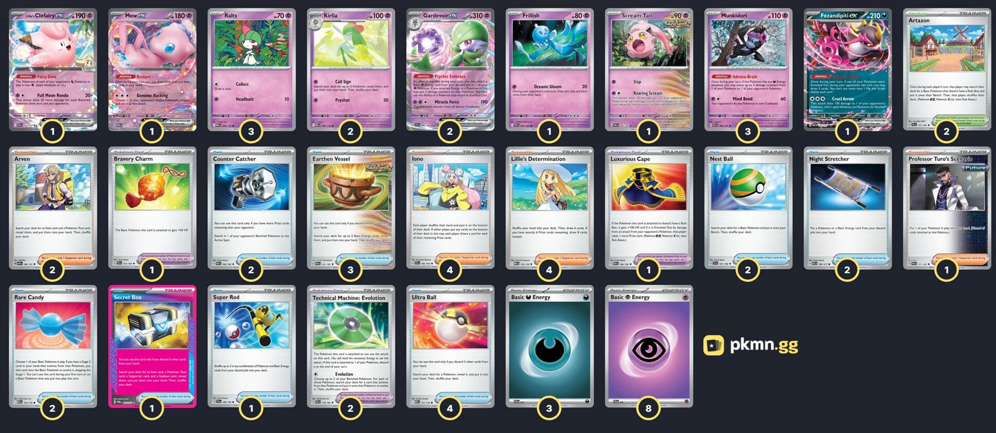 Pokémon: 15 3 Ralts MEG 58 2 Kirlia MEG 59 2 Gardevoir ex SVI 86 3 Munkidori ASC 99 1 Mew ex MEW 151 1 Lillie's Clefairy ex ASC 76 1 Scream Tail PAR 86 1 Fezandipiti ex ASC 142 1 Frillish WHT 44 Trainer: 34 4 Lillie's Determination MEG 119 4 Iono PAL 185 2 Arven OBF 186 1 Professor Turo's Scenario PAR 171 4 Ultra Ball MEG 131 3 Earthen Vessel PAR 163 2 Night Stretcher ASC 196 2 Nest Ball SVI 181 2 Counter Catcher PAR 160 2 Rare Candy MEG 125 1 Super Rod PAL 188 1 Secret Box TWM 163 2 Technical Machine: Evolution PAR 178 1 Bravery Charm PAL 173 1 Luxurious Cape PAR 166 2 Artazon PAL 171 Energy: 11 8 Psychic Energy MEE 5 3 Darkness Energy MEE 7 |