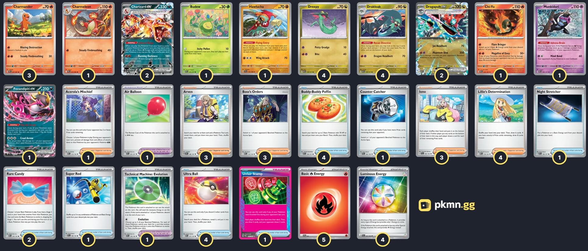 Pokémon: 21 4 Dreepy ASC 158 4 Drakloak ASC 159 2 Dragapult ex ASC 160 3 Charmander PAF 7 1 Charmeleon PFL 12 2 Charizard ex OBF 125 1 Budew ASC 16 1 Munkidori ASC 99 1 Hawlucha SVI 118 1 Chi-Yu PAR 29 1 Fezandipiti ex ASC 142 Trainer: 30 4 Lillie's Determination MEG 119 3 Boss's Orders MEG 114 3 Arven OBF 186 3 Iono PAL 185 1 Acerola's Mischief MEG 113 4 Buddy-Buddy Poffin ASC 184 4 Ultra Ball MEG 131 2 Rare Candy MEG 125 1 Super Rod PAL 188 1 Night Stretcher ASC 196 1 Counter Catcher PAR 160 1 Unfair Stamp TWM 165 1 Air Balloon ASC 181 1 Technical Machine: Evolution PAR 178 Energy: 9 5 Fire Energy MEE 2 4 Luminous Energy PAL 191 |