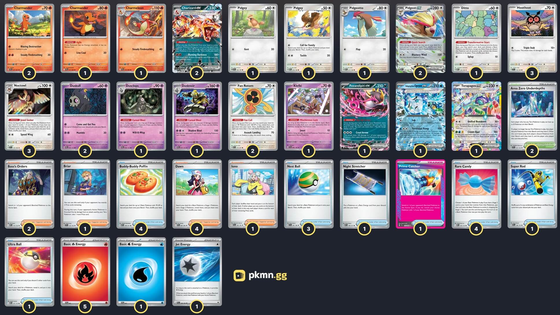 Pokémon: 28 3 Hoothoot SCR 114 3 Noctowl SCR 115 2 Charmander PAF 7 1 Charmander PFL 11 1 Charmeleon PFL 12 2 Charizard ex OBF 125 2 Duskull PRE 35 1 Dusclops PRE 36 1 Dusknoir PRE 37 1 Pidgey MEW 16 1 Pidgey OBF 162 1 Pidgeotto MEW 17 2 Pidgeot ex OBF 164 2 Fan Rotom ASC 171 1 Klefki SVI 96 1 Ditto MEW 132 1 Fezandipiti ex ASC 142 1 Wellspring Mask Ogerpon ex TWM 64 1 Terapagos ex ASC 179 Trainer: 25 4 Dawn PFL 87 2 Boss's Orders MEG 114 1 Iono PAL 185 1 Briar SCR 132 4 Rare Candy MEG 125 4 Buddy-Buddy Poffin ASC 184 3 Nest Ball SVI 181 1 Ultra Ball MEG 131 1 Night Stretcher ASC 196 1 Super Rod PAL 188 1 Prime Catcher TEF 157 2 Area Zero Underdepths SCR 131 Energy: 7 5 Fire Energy MEE 2 1 Water Energy MEE 3 1 Jet Energy PAL 190 |