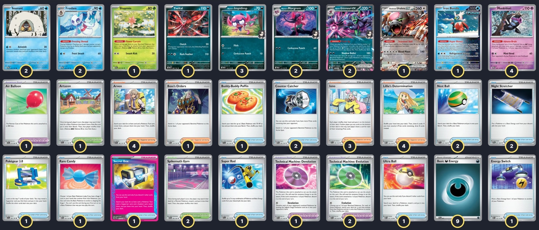 Pokémon: 19 4 Munkidori TWM 95 3 Marnie's Impidimp DRI 134 2 Marnie's Morgrem DRI 135 2 Marnie's Grimmsnarl ex DRI 136 2 Snorunt TWM 51 2 Froslass TWM 53 1 Shaymin DRI 10 1 Iron Bundle PAR 56 1 Yveltal MEG 88 1 Bloodmoon Ursaluna ex TWM 141 Trainer: 32 4 Arven OBF 186 4 Lillie's Determination MEG 119 3 Iono PAL 185 1 Boss's Orders MEG 114 2 Counter Catcher PAR 160 2 Night Stretcher SFA 61 2 Nest Ball SVI 181 1 Ultra Ball MEG 131 1 Rare Candy MEG 125 1 Energy Switch MEG 115 1 Buddy-Buddy Poffin TEF 144 1 Super Rod PAL 188 1 Pokégear 3.0 SVI 186 1 Secret Box TWM 163 2 Technical Machine: Evolution PAR 178 1 Technical Machine: Devolution PAR 177 1 Air Balloon BLK 79 2 Spikemuth Gym DRI 169 1 Artazon PAL 171 Energy: 9 9 Darkness Energy SVE 23 |