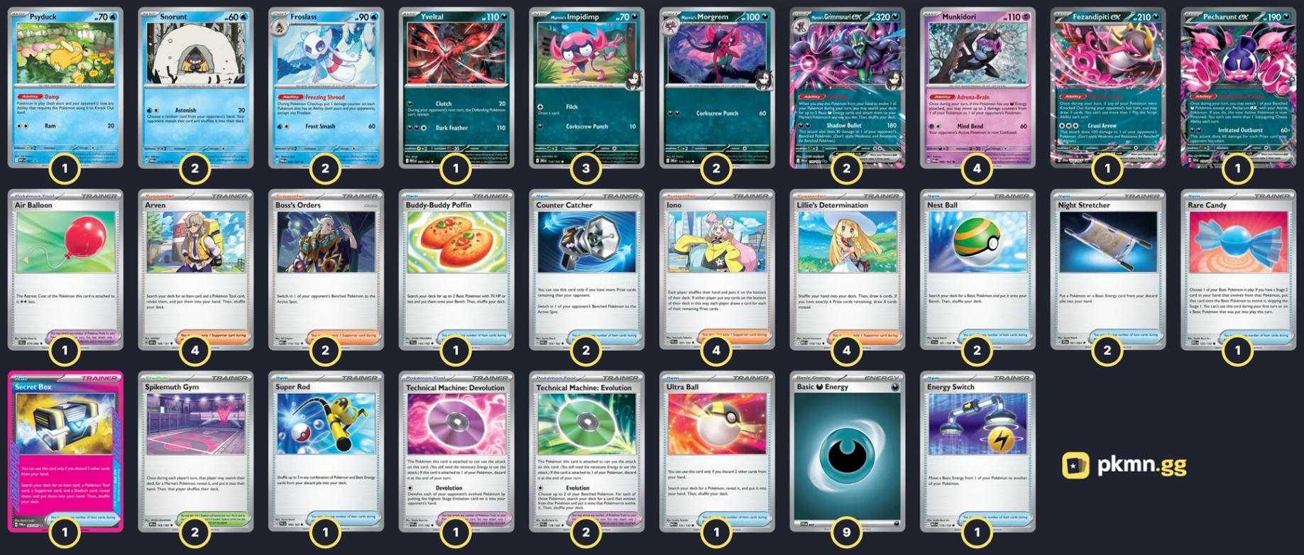 Pokémon: 19 3 Marnie's Impidimp DRI 134 2 Marnie's Morgrem DRI 135 2 Marnie's Grimmsnarl ex DRI 136 4 Munkidori TWM 95 2 Snorunt TWM 51 2 Froslass TWM 53 1 Yveltal MEG 88 1 Pecharunt ex SFA 39 1 Fezandipiti ex SFA 38 1 Psyduck MEP 7 Trainer: 32 4 Arven OBF 186 4 Lillie's Determination MEG 119 4 Iono PAL 185 2 Boss's Orders MEG 114 2 Counter Catcher PAR 160 2 Nest Ball SVI 181 2 Night Stretcher SFA 61 1 Super Rod PAL 188 1 Buddy-Buddy Poffin TEF 144 1 Ultra Ball MEG 131 1 Rare Candy MEG 125 1 Energy Switch MEG 115 1 Secret Box TWM 163 2 Technical Machine: Evolution PAR 178 1 Technical Machine: Devolution PAR 177 1 Air Balloon BLK 79 2 Spikemuth Gym DRI 169 Energy: 9 9 Darkness Energy SVE 23