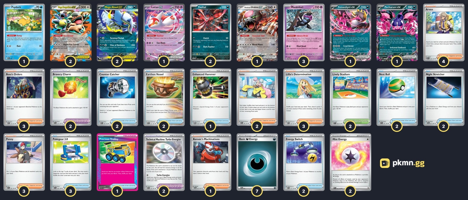 Pokémon: 14 3 Munkidori TWM 95 2 Mega Absol ex MEG 86 2 Mega Kangaskhan ex MEG 104 2 Yveltal MEG 88 1 Pecharunt ex SFA 39 1 Fezandipiti ex SFA 38 1 Latias ex SSP 76 1 Bloodmoon Ursaluna ex TWM 141 1 Psyduck MEP 7 Trainer: 37 4 Arven OBF 186 3 Lillie's Determination MEG 119 3 Boss's Orders MEG 114 3 Penny SVI 183 2 Iono PAL 185 1 Xerosic's Machinations SFA 64 3 Pokégear 3.0 SVI 186 2 Nest Ball SVI 181 2 Night Stretcher SFA 61 2 Counter Catcher PAR 160 2 Earthen Vessel PAR 163 2 Energy Switch MEG 115 1 Precious Trolley SSP 185 1 Enhanced Hammer TWM 148 2 Bravery Charm PAL 173 2 Technical Machine: Turbo Energize PAR 179 2 Lively Stadium SSP 180 Energy: 9 7 Darkness Energy SVE 23 2 Mist Energy TEF 161 |