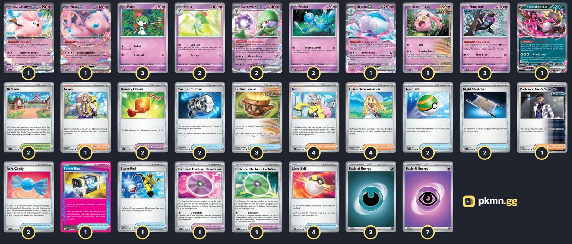Pokémon: 17 3 Ralts MEG 58 2 Kirlia MEG 59 2 Gardevoir ex SVI 86 3 Munkidori TWM 95 2 Frillish WHT 44 1 Jellicent ex WHT 45 1 Mew ex MEW 151 1 Lillie's Clefairy ex JTG 56 1 Fezandipiti ex SFA 38 1 Scream Tail PAR 86 Trainer: 33 4 Lillie's Determination MEG 119 4 Iono PAL 185 1 Arven OBF 186 1 Professor Turo's Scenario PAR 171 4 Ultra Ball MEG 131 3 Earthen Vessel PAR 163 2 Rare Candy MEG 125 2 Nest Ball SVI 181 2 Night Stretcher SFA 61 2 Counter Catcher PAR 160 1 Secret Box TWM 163 1 Super Rod PAL 188 2 Bravery Charm PAL 173 1 Technical Machine: Devolution PAR 177 1 Technical Machine: Evolution PAR 178 2 Artazon PAL 171 Energy: 10 7 Psychic Energy MEE 5 3 Darkness Energy MEE 7 |