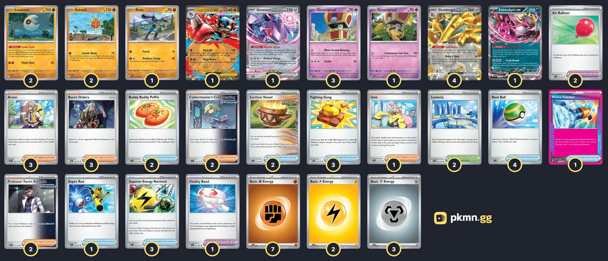Pokémon: 16 3 Gimmighoul SSP 97 1 Gimmighoul PAR 88 4 Gholdengo ex PAR 139 2 Solrock MEG 75 2 Lunatone MEG 74 1 Riolu SVI 113 1 Mega Lucario ex MEG 77 1 Genesect ex BLK 67 1 Fezandipiti ex SFA 38 Trainer: 32 3 Arven OBF 186 3 Boss's Orders MEG 114 2 Ciphermaniac's Codebreaking TEF 145 2 Professor Turo's Scenario PAR 171 1 Iono PAL 185 4 Nest Ball SVI 181 3 Superior Energy Retrieval PAL 189 3 Fighting Gong MEG 116 2 Earthen Vessel PAR 163 2 Buddy-Buddy Poffin TEF 144 1 Super Rod PAL 188 1 Prime Catcher TEF 157 2 Air Balloon BLK 79 1 Vitality Band SVI 197 2 Levincia JTG 150 Energy: 12 7 Fighting Energy MEE 6 3 Metal Energy MEE 8 2 Lightning Energy MEE 4 |