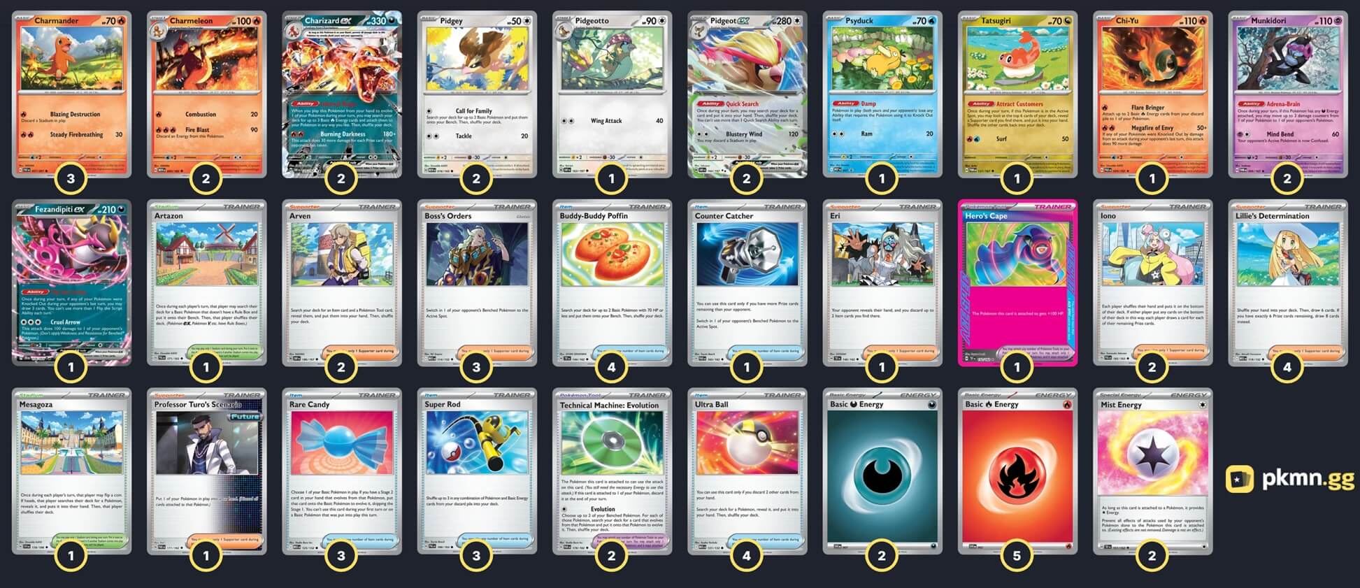 Pokémon: 17 3 Ralts MEG 58 2 Kirlia MEG 59 2 Gardevoir ex SVI 86 3 Munkidori TWM 95 1 Fezandipiti ex SFA 38 1 Lillie's Clefairy ex JTG 56 1 Mew ex MEW 151 1 Iron Bundle PAR 56 1 Scream Tail PAR 86 1 Frillish WHT 44 1 Drifloon SVI 89 Trainer: 32 4 Iono PAL 185 3 Lillie's Determination MEG 119 2 Professor's Research JTG 155 1 Arven OBF 186 1 Professor Turo's Scenario PAR 171 4 Ultra Ball MEG 131 3 Earthen Vessel PAR 163 2 Rare Candy MEG 125 2 Nest Ball SVI 181 2 Night Stretcher SFA 61 1 Secret Box TWM 163 1 Counter Catcher PAR 160 1 Super Rod PAL 188 2 Bravery Charm PAL 173 1 Technical Machine: Evolution PAR 178 2 Artazon PAL 171 Energy: 11 8 Psychic Energy SVE 21 3 Darkness Energy SVE 23 |