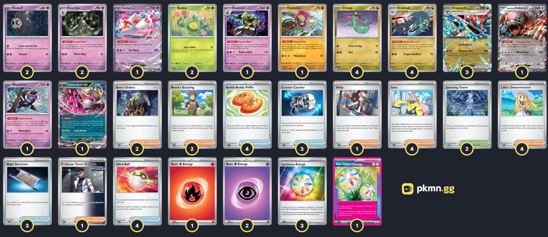 Pokémon: 23 4 Dreepy TWM 128 4 Drakloak TWM 129 3 Dragapult ex TWM 130 2 Duskull PRE 35 2 Dusclops PRE 36 1 Dusknoir PRE 37 2 Budew PRE 4 1 Bloodmoon Ursaluna ex TWM 141 1 Fezandipiti ex SFA 38 1 Latias ex SSP 76 1 Munkidori TWM 95 1 Hawlucha SVI 118 Trainer: 30 4 Lillie's Determination MEG 119 4 Iono PAL 185 2 Boss's Orders MEG 114 2 Brock's Scouting JTG 146 1 Hilda WHT 84 1 Professor Turo's Scenario PAR 171 4 Buddy-Buddy Poffin TEF 144 4 Ultra Ball MEG 131 3 Counter Catcher PAR 160 3 Night Stretcher SFA 61 2 Jamming Tower TWM 153 Energy: 7 3 Luminous Energy PAL 191 2 Psychic Energy SVE 21 1 Fire Energy SVE 18 1 Neo Upper Energy TEF 162 |