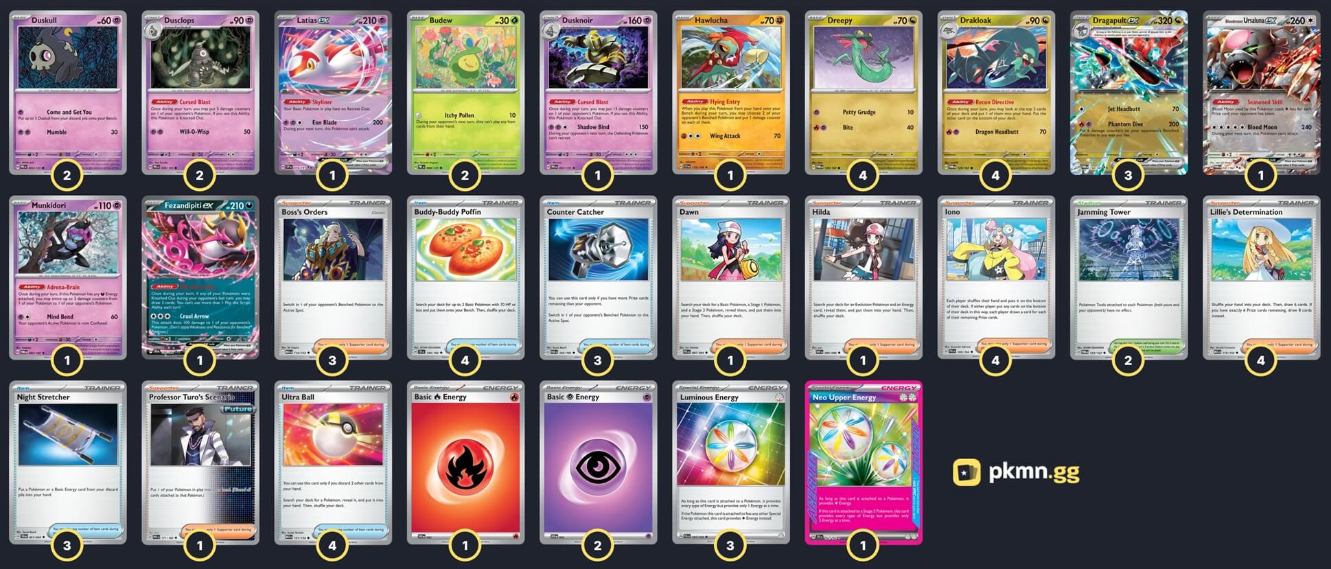 Pokémon: 23 4 Dreepy TWM 128 4 Drakloak TWM 129 3 Dragapult ex TWM 130 2 Duskull PRE 35 2 Dusclops PRE 36 1 Dusknoir PRE 37 2 Budew PRE 4 1 Hawlucha SVI 118 1 Munkidori TWM 95 1 Bloodmoon Ursaluna ex TWM 141 1 Fezandipiti ex SFA 38 1 Latias ex SSP 76 Trainer: 30 4 Iono PAL 185 4 Lillie's Determination MEG 119 3 Boss's Orders MEG 114 1 Dawn PFL 87 1 Hilda WHT 84 1 Professor Turo's Scenario PAR 171 4 Ultra Ball MEG 131 4 Buddy-Buddy Poffin TEF 144 3 Counter Catcher PAR 160 3 Night Stretcher SFA 61 2 Jamming Tower TWM 153 Energy: 7 3 Luminous Energy PAL 191 2 Psychic Energy MEE 5 1 Fire Energy MEE 2 1 Neo Upper Energy TEF 162 |