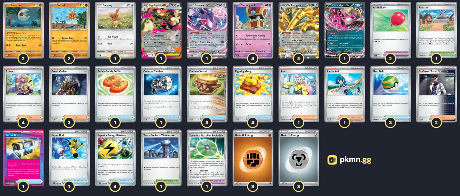 Pokémon: 15 4 Gimmighoul SSP 97 3 Gholdengo ex PAR 139 2 Solrock MEG 75 2 Lunatone MEG 74 1 Buneary PFL 83 1 Mega Lopunny ex PFL 84 1 Fezandipiti ex SFA 38 1 Genesect ex BLK 67 Trainer: 34 4 Arven OBF 186 3 Boss's Orders MEG 114 2 Professor Turo's Scenario PAR 171 1 Lana's Aid TWM 155 1 Iono PAL 185 4 Superior Energy Retrieval PAL 189 4 Fighting Gong MEG 116 3 Nest Ball SVI 181 3 Earthen Vessel PAR 163 1 Counter Catcher PAR 160 1 Secret Box TWM 163 1 Buddy-Buddy Poffin TEF 144 1 Super Rod PAL 188 2 Air Balloon BLK 79 1 Technical Machine: Evolution PAR 178 1 Artazon PAL 171 1 Team Rocket's Watchtower DRI 180 Energy: 11 8 Fighting Energy MEE 6 3 Metal Energy MEE 8 |