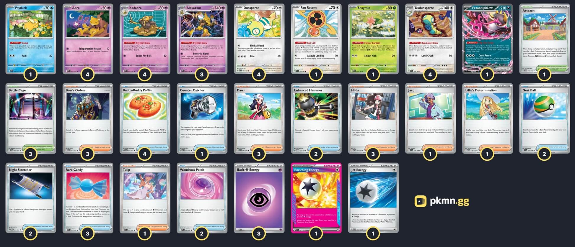 Pokémon: 20 3 Hoothoot SCR 114 3 Noctowl SCR 115 2 Teal Mask Ogerpon ex TWM 25 2 Raging Bolt ex TEF 123 2 Fan Rotom SCR 118 1 Ditto MEW 132 1 Mew ex MEW 151 1 Wellspring Mask Ogerpon ex TWM 64 1 Fezandipiti ex ASC 142 1 Raging Bolt SCR 111 1 Latias ex SSP 76 1 Mega Kangaskhan ex MEG 104 1 Budew ASC 16 Trainer: 28 4 Crispin SCR 133 3 Professor Sada's Vitality PAR 170 1 Boss's Orders MEG 114 1 Professor Turo's Scenario PAR 171 1 Iono PAL 185 4 Nest Ball SVI 181 4 Ultra Ball MEG 131 2 Earthen Vessel PAR 163 2 Night Stretcher ASC 196 1 Energy Switch MEG 115 1 Prime Catcher TEF 157 1 Glass Trumpet SCR 135 2 Area Zero Underdepths SCR 131 1 Artazon PAL 171 Energy: 12 5 Grass Energy MEE 1 3 Fighting Energy MEE 6 3 Lightning Energy MEE 4 1 Water Energy MEE 3 |