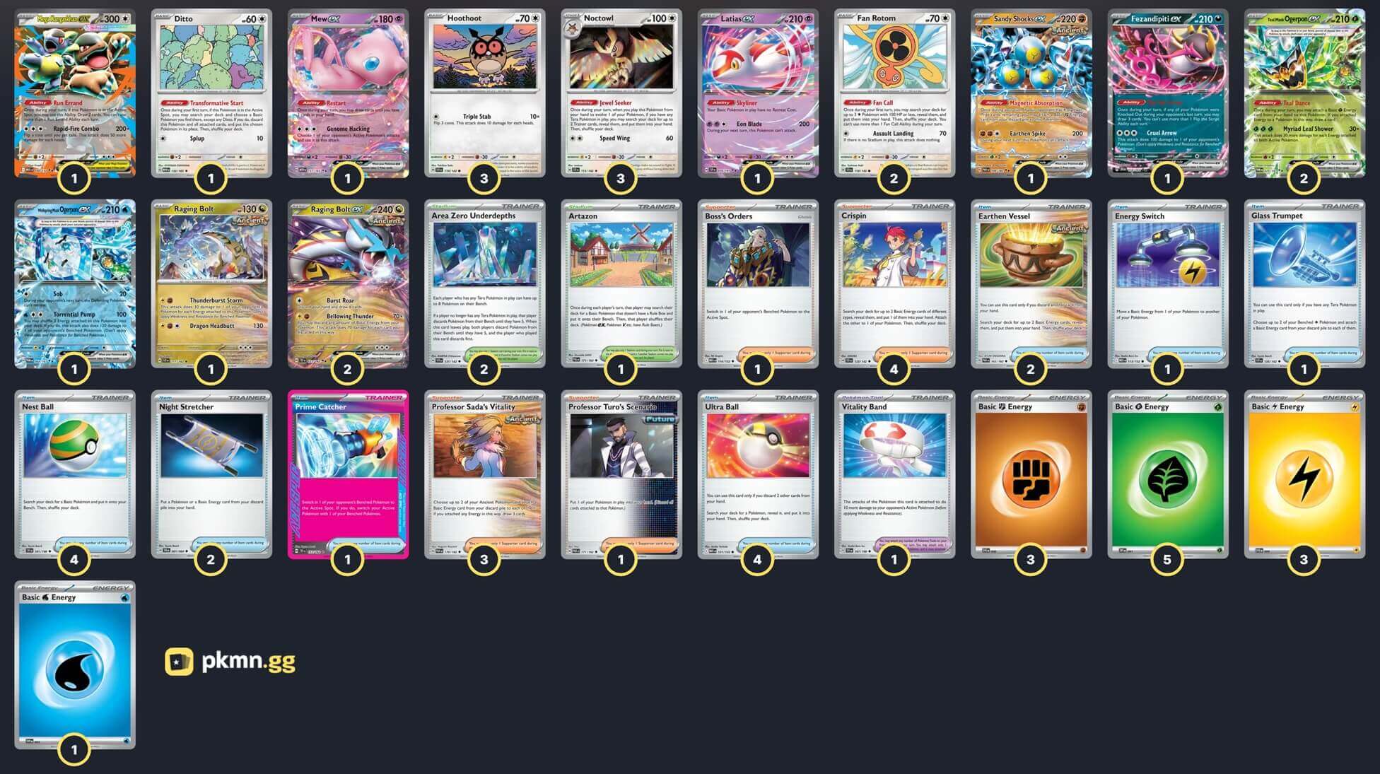 Pokémon: 20 3 Hoothoot SCR 114 3 Noctowl SCR 115 2 Fan Rotom SCR 118 2 Teal Mask Ogerpon ex TWM 25 2 Raging Bolt ex TEF 123 1 Ditto MEW 132 1 Wellspring Mask Ogerpon ex TWM 64 1 Raging Bolt SCR 111 1 Fezandipiti ex SFA 38 1 Latias ex SSP 76 1 Mew ex MEW 151 1 Sandy Shocks ex PAR 108 1 Mega Kangaskhan ex MEG 104 Trainer: 28 4 Crispin SCR 133 3 Professor Sada's Vitality PAR 170 1 Boss's Orders MEG 114 1 Professor Turo's Scenario PAR 171 4 Ultra Ball MEG 131 4 Nest Ball SVI 181 2 Night Stretcher SFA 61 2 Earthen Vessel PAR 163 1 Prime Catcher TEF 157 1 Energy Switch MEG 115 1 Glass Trumpet SCR 135 1 Vitality Band SVI 197 2 Area Zero Underdepths SCR 131 1 Artazon PAL 171 Energy: 12 5 Grass Energy MEE 1 3 Fighting Energy MEE 6 3 Lightning Energy MEE 4 1 Water Energy MEE 3 |