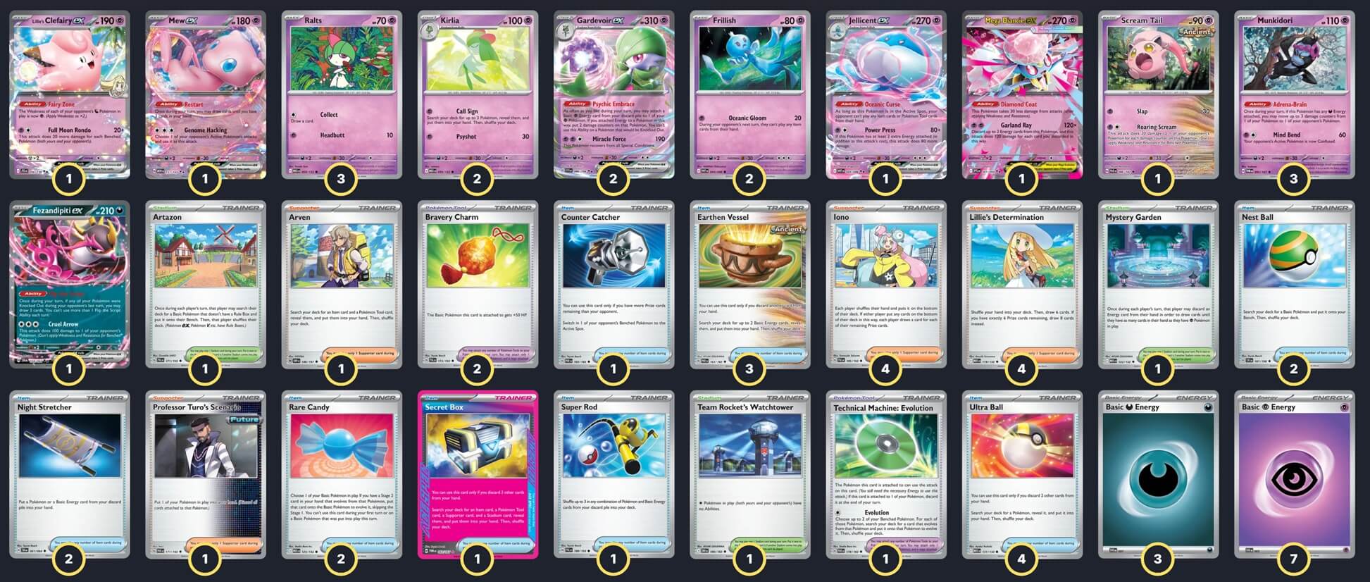 Pokémon: 18 3 Ralts MEG 58 2 Kirlia MEG 59 2 Gardevoir ex SVI 86 3 Munkidori TWM 95 2 Frillish WHT 44 1 Jellicent ex WHT 45 1 Scream Tail PAR 86 1 Fezandipiti ex SFA 38 1 Lillie's Clefairy ex JTG 56 1 Mew ex MEW 151 1 Mega Diancie ex PFL 41 Trainer: 32 4 Lillie's Determination MEG 119 4 Iono PAL 185 1 Arven OBF 186 1 Professor Turo's Scenario PAR 171 4 Ultra Ball MEG 131 3 Earthen Vessel PAR 163 2 Nest Ball SVI 181 2 Rare Candy MEG 125 2 Night Stretcher SFA 61 1 Super Rod PAL 188 1 Secret Box TWM 163 1 Counter Catcher PAR 160 2 Bravery Charm PAL 173 1 Technical Machine: Evolution PAR 178 1 Artazon PAL 171 1 Team Rocket's Watchtower DRI 180 1 Mystery Garden MEG 122 Energy: 10 7 Psychic Energy MEE 5 3 Darkness Energy MEE 7 |