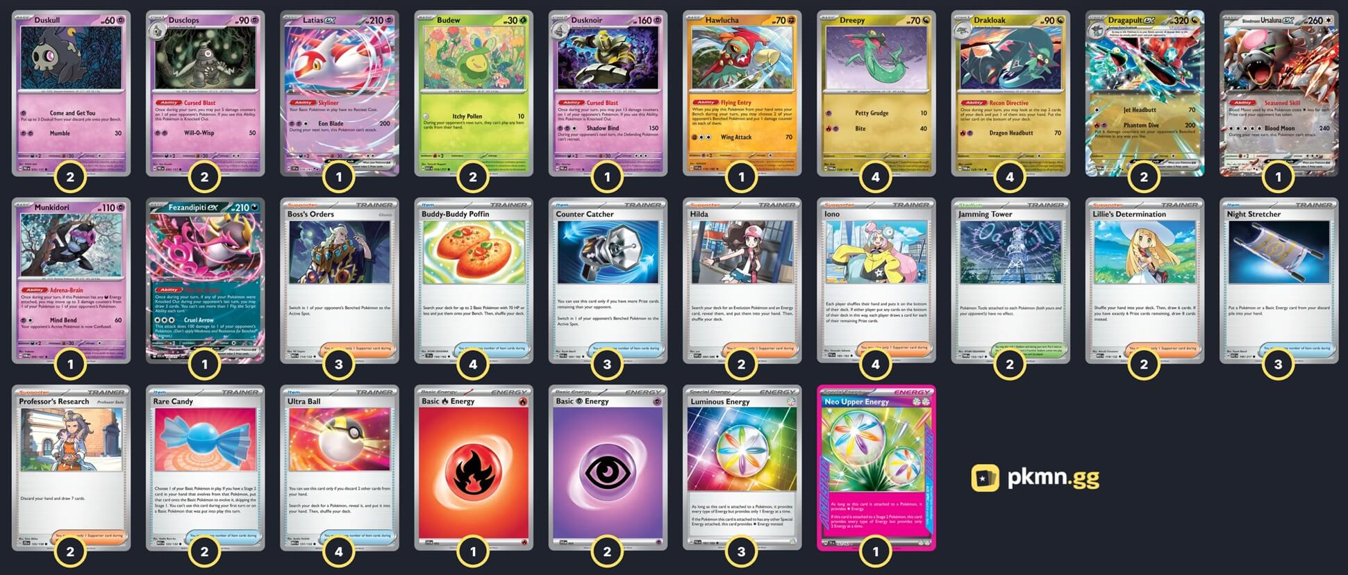 Pokémon: 22 4 Dreepy TWM 128 4 Drakloak TWM 129 2 Dragapult ex TWM 130 2 Duskull PRE 35 2 Dusclops PRE 36 1 Dusknoir PRE 37 2 Budew ASC 16 1 Latias ex SSP 76 1 Hawlucha SVI 118 1 Bloodmoon Ursaluna ex TWM 141 1 Munkidori TWM 95 1 Fezandipiti ex ASC 142 Trainer: 31 4 Iono PAL 185 3 Boss's Orders MEG 114 2 Professor's Research JTG 155 2 Hilda WHT 84 2 Lillie's Determination MEG 119 4 Ultra Ball MEG 131 4 Buddy-Buddy Poffin TEF 144 3 Night Stretcher ASC 196 3 Counter Catcher PAR 160 2 Rare Candy MEG 125 2 Jamming Tower TWM 153 Energy: 7 3 Luminous Energy PAL 191 2 Psychic Energy MEE 5 1 Neo Upper Energy TEF 162 1 Fire Energy MEE 2 |