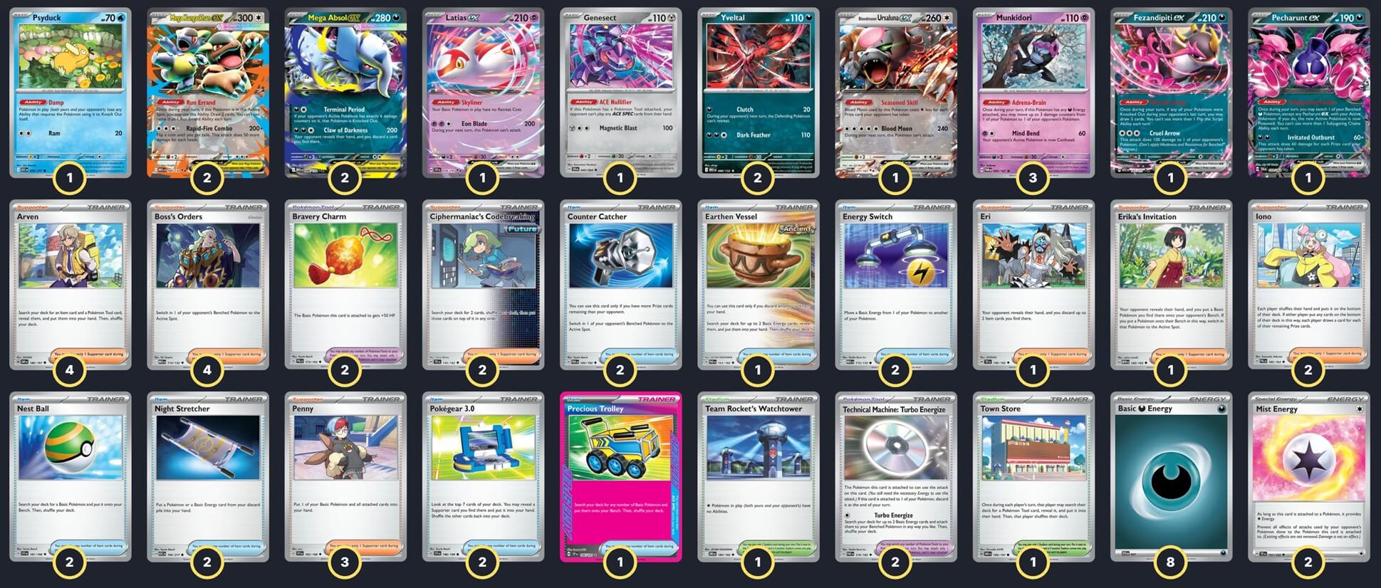 Pokémon: 15 3 Munkidori TWM 95 2 Mega Absol ex MEG 86 2 Yveltal MEG 88 2 Mega Kangaskhan ex MEG 104 1 Genesect SFA 40 1 Pecharunt ex SFA 39 1 Latias ex SSP 76 1 Psyduck ASC 39 1 Fezandipiti ex ASC 142 1 Bloodmoon Ursaluna ex TWM 141 Trainer: 35 4 Arven OBF 186 4 Boss's Orders MEG 114 3 Penny SVI 183 2 Ciphermaniac's Codebreaking TEF 145 2 Iono PAL 185 1 Erika's Invitation MEW 160 1 Eri TEF 146 2 Night Stretcher ASC 196 2 Pokégear 3.0 SVI 186 2 Counter Catcher PAR 160 2 Nest Ball SVI 181 2 Energy Switch MEG 115 1 Precious Trolley SSP 185 1 Earthen Vessel PAR 163 2 Bravery Charm PAL 173 2 Technical Machine: Turbo Energize PAR 179 1 Town Store OBF 196 1 Team Rocket's Watchtower DRI 180 Energy: 10 8 Darkness Energy MEE 7 2 Mist Energy TEF 161 |