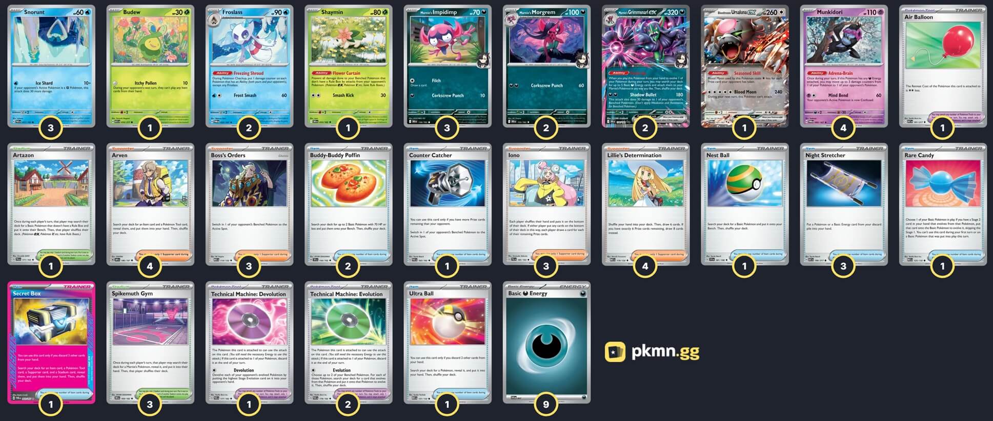 Pokémon: 19 4 Munkidori TWM 95 3 Marnie's Impidimp DRI 134 2 Marnie's Morgrem DRI 135 2 Marnie's Grimmsnarl ex DRI 136 3 Snorunt PAR 37 2 Froslass TWM 53 1 Shaymin DRI 10 1 Bloodmoon Ursaluna ex TWM 141 1 Budew ASC 16 Trainer: 32 4 Lillie's Determination MEG 119 4 Arven OBF 186 3 Iono PAL 185 3 Boss's Orders MEG 114 3 Night Stretcher ASC 196 2 Buddy-Buddy Poffin TEF 144 1 Nest Ball SVI 181 1 Ultra Ball MEG 131 1 Rare Candy MEG 125 1 Secret Box TWM 163 1 Counter Catcher PAR 160 2 Technical Machine: Evolution PAR 178 1 Technical Machine: Devolution PAR 177 1 Air Balloon ASC 181 3 Spikemuth Gym DRI 169 1 Artazon PAL 171 Energy: 9 9 Darkness Energy MEE 7 |
