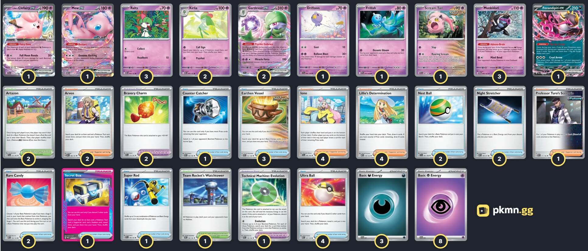 Pokémon: 16 3 Ralts MEG 58 2 Kirlia MEG 59 2 Gardevoir ex SVI 86 3 Munkidori TWM 95 1 Scream Tail PAR 86 1 Frillish WHT 44 1 Drifloon SVI 89 1 Mew ex MEW 151 1 Lillie's Clefairy ex JTG 56 1 Fezandipiti ex ASC 142 Trainer: 33 4 Lillie's Determination MEG 119 4 Iono PAL 185 2 Arven OBF 186 1 Professor Turo's Scenario PAR 171 4 Ultra Ball MEG 131 3 Earthen Vessel PAR 163 2 Rare Candy MEG 125 2 Nest Ball SVI 181 2 Night Stretcher ASC 196 1 Super Rod PAL 188 1 Counter Catcher PAR 160 1 Secret Box TWM 163 2 Bravery Charm PAL 173 1 Technical Machine: Evolution PAR 178 2 Artazon PAL 171 1 Team Rocket's Watchtower DRI 180 Energy: 11 8 Psychic Energy MEE 5 3 Darkness Energy MEE 7 |