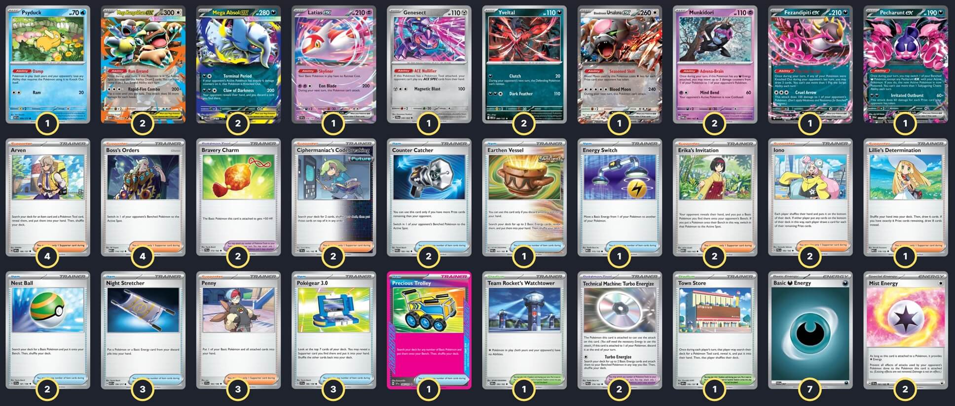 Pokémon: 14 2 Yveltal MEG 88 2 Munkidori TWM 95 2 Mega Kangaskhan ex MEG 104 2 Mega Absol ex MEG 86 1 Genesect SFA 40 1 Psyduck ASC 39 1 Fezandipiti ex ASC 142 1 Pecharunt ex SFA 39 1 Latias ex SSP 76 1 Bloodmoon Ursaluna ex TWM 141 Trainer: 37 4 Boss's Orders MEG 114 4 Arven OBF 186 3 Penny SVI 183 2 Erika's Invitation MEW 160 2 Iono PAL 185 2 Ciphermaniac's Codebreaking TEF 145 1 Lillie's Determination MEG 119 3 Pokégear 3.0 SVI 186 3 Night Stretcher ASC 196 2 Counter Catcher PAR 160 2 Nest Ball SVI 181 1 Precious Trolley SSP 185 1 Energy Switch MEG 115 1 Earthen Vessel PAR 163 2 Technical Machine: Turbo Energize PAR 179 2 Bravery Charm PAL 173 1 Town Store OBF 196 1 Team Rocket's Watchtower DRI 180 Energy: 9 7 Darkness Energy MEE 7 2 Mist Energy TEF 161 |