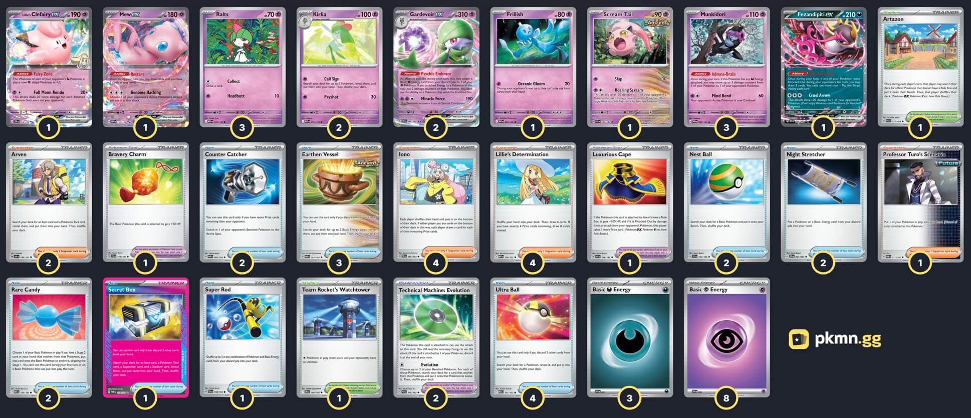 Pokémon: 15 3 Ralts MEG 58 2 Kirlia MEG 59 2 Gardevoir ex SVI 86 3 Munkidori TWM 95 1 Scream Tail PAR 86 1 Frillish WHT 44 1 Lillie's Clefairy ex JTG 56 1 Mew ex MEW 151 1 Fezandipiti ex SFA 38 Trainer: 34 4 Lillie's Determination MEG 119 4 Iono PAL 185 2 Arven OBF 186 1 Professor Turo's Scenario PAR 171 4 Ultra Ball MEG 131 3 Earthen Vessel PAR 163 2 Nest Ball SVI 181 2 Night Stretcher SFA 61 2 Counter Catcher PAR 160 2 Rare Candy MEG 125 1 Super Rod PAL 188 1 Secret Box TWM 163 2 Technical Machine: Evolution PAR 178 1 Bravery Charm PAL 173 1 Luxurious Cape PAR 166 1 Artazon PAL 171 1 Team Rocket's Watchtower DRI 180 Energy: 11 8 Psychic Energy MEE 5 3 Darkness Energy MEE 7 |