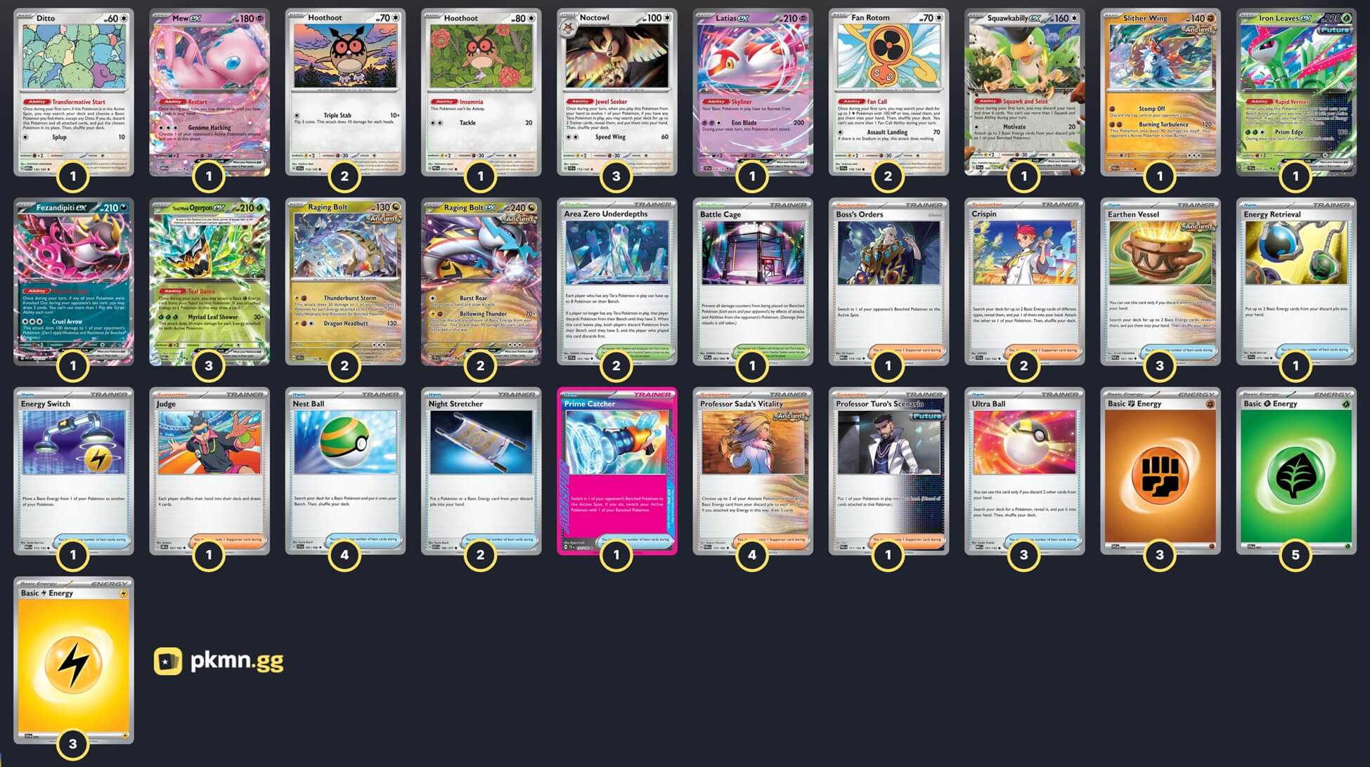 Pokémon: 22 2 Hoothoot SCR 114 1 Hoothoot PRE 77 3 Noctowl SCR 115 3 Teal Mask Ogerpon ex TWM 25 2 Raging Bolt SCR 111 2 Raging Bolt ex TEF 123 2 Fan Rotom SCR 118 1 Latias ex SSP 76 1 Fezandipiti ex ASC 142 1 Iron Leaves ex TEF 25 1 Mew ex MEW 151 1 Slither Wing PAR 107 1 Squawkabilly ex PAL 169 1 Ditto MEW 132 Trainer: 27 4 Professor Sada's Vitality PAR 170 2 Crispin SCR 133 1 Boss's Orders MEG 114 1 Professor Turo's Scenario PAR 171 1 Judge DRI 167 4 Nest Ball SVI 181 3 Ultra Ball MEG 131 3 Earthen Vessel PAR 163 2 Night Stretcher ASC 196 1 Energy Switch MEG 115 1 Energy Retrieval SVI 171 1 Prime Catcher TEF 157 2 Area Zero Underdepths SCR 131 1 Battle Cage PFL 85 Energy: 11 5 Grass Energy MEE 1 3 Lightning Energy MEE 4 3 Fighting Energy MEE 6 |