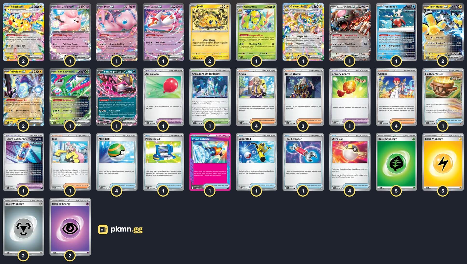 Pokémon: 17 2 Joltik SCR 50 1 Galvantula ex SCR 51 1 Galvantula SFA 2 2 Iron Hands ex PAR 70 2 Miraidon ex SVI 81 2 Pikachu ex SSP 57 1 Mew ex MEW 151 1 Bloodmoon Ursaluna ex TWM 141 1 Iron Leaves ex TEF 25 1 Fezandipiti ex ASC 142 1 Lillie's Clefairy ex JTG 56 1 Latias ex SSP 76 1 Iron Bundle PAR 56 Trainer: 29 4 Arven OBF 186 4 Crispin SCR 133 3 Boss's Orders MEG 114 1 Iono PAL 185 4 Nest Ball SVI 181 4 Ultra Ball MEG 131 1 Super Rod PAL 188 1 Tool Scrapper ASC 212 1 Earthen Vessel PAR 163 1 Pokégear 3.0 SVI 186 1 Prime Catcher TEF 157 1 Future Booster Energy Capsule TEF 149 1 Bravery Charm PAL 173 1 Air Balloon ASC 181 1 Area Zero Underdepths SCR 131 Energy: 14 5 Lightning Energy MEE 4 5 Grass Energy MEE 1 2 Psychic Energy MEE 5 2 Metal Energy MEE 8 |