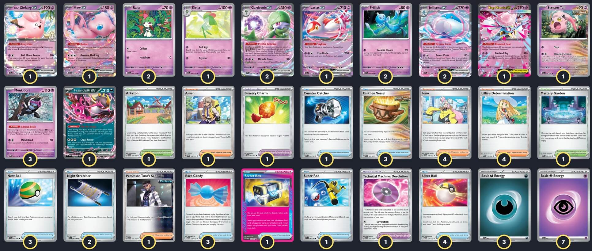 Pokémon: 18 3 Munkidori TWM 95 2 Frillish WHT 44 2 Jellicent ex WHT 45 2 Ralts MEG 58 1 Kirlia MEG 59 2 Gardevoir ex SVI 86 1 Lillie's Clefairy ex JTG 56 1 Scream Tail PAR 86 1 Mew ex MEW 151 1 Fezandipiti ex SFA 38 1 Mega Diancie ex PFL 41 1 Latias ex SSP 76 Trainer: 32 4 Lillie's Determination MEG 119 4 Iono PAL 185 1 Arven OBF 186 1 Professor Turo's Scenario PAR 171 4 Ultra Ball MEG 131 3 Earthen Vessel PAR 163 3 Nest Ball SVI 181 3 Rare Candy MEG 125 2 Night Stretcher SFA 61 1 Counter Catcher PAR 160 1 Secret Box TWM 163 1 Super Rod PAL 188 1 Technical Machine: Devolution PAR 177 1 Bravery Charm PAL 173 1 Artazon PAL 171 1 Mystery Garden MEG 122 Energy: 10 7 Psychic Energy MEE 5 3 Darkness Energy MEE 7 |