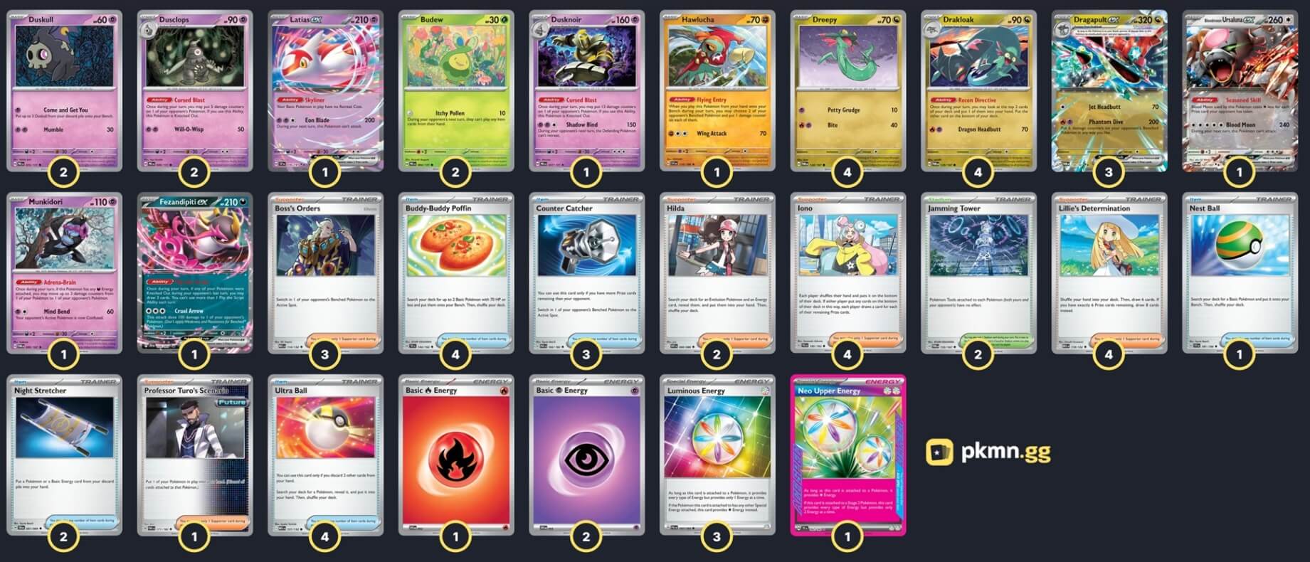 Pokémon: 23 4 Dreepy TWM 128 4 Drakloak TWM 129 3 Dragapult ex TWM 130 2 Duskull PRE 35 2 Dusclops PRE 36 1 Dusknoir PRE 37 2 Budew PRE 4 1 Bloodmoon Ursaluna ex TWM 141 1 Fezandipiti ex SFA 38 1 Latias ex SSP 76 1 Munkidori TWM 95 1 Hawlucha SVI 118 Trainer: 30 4 Lillie's Determination MEG 119 4 Iono PAL 185 3 Boss's Orders MEG 114 2 Hilda WHT 84 1 Professor Turo's Scenario PAR 171 4 Buddy-Buddy Poffin TEF 144 4 Ultra Ball MEG 131 3 Counter Catcher PAR 160 2 Night Stretcher SFA 61 1 Nest Ball SVI 181 2 Jamming Tower TWM 153 Energy: 7 3 Luminous Energy PAL 191 2 Psychic Energy SVE 21 1 Fire Energy SVE 18 1 Neo Upper Energy TEF 162 |