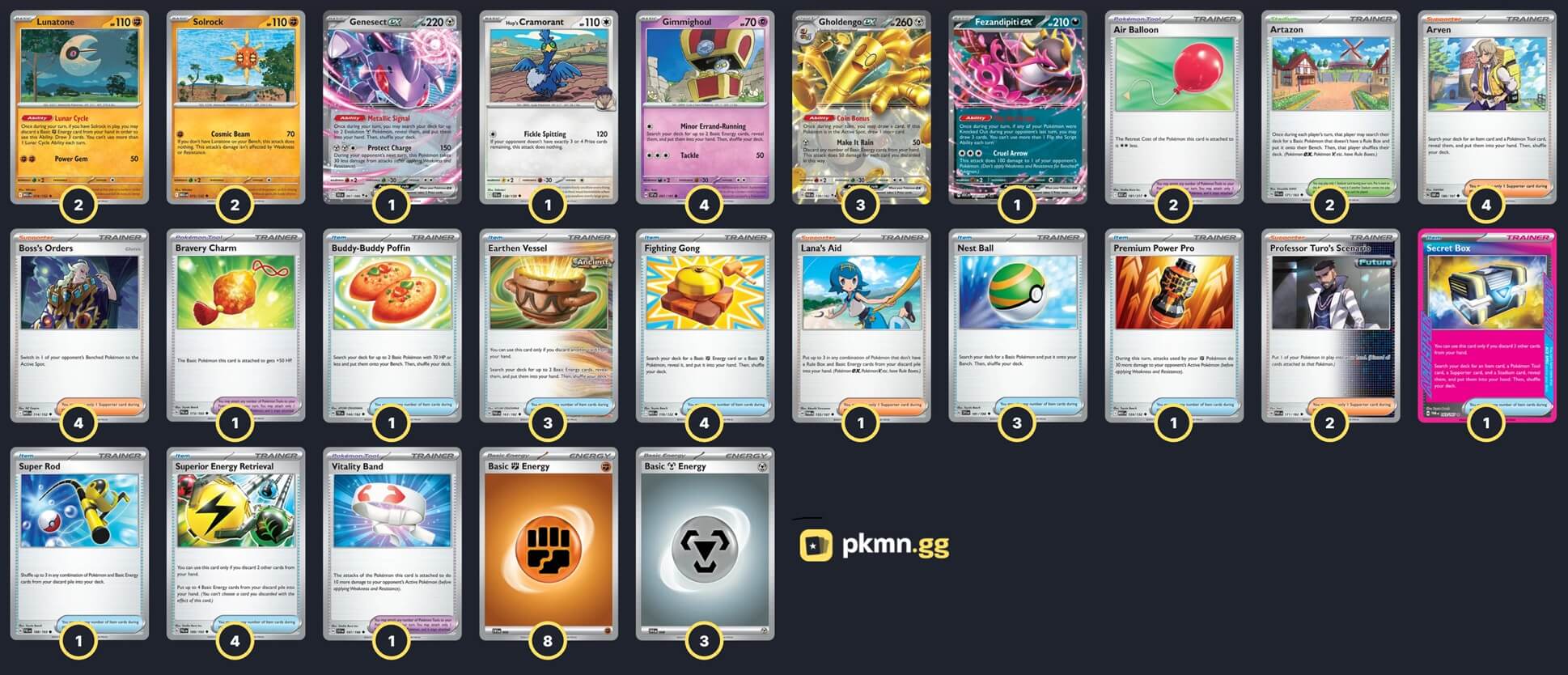 Pokémon: 14 4 Gimmighoul SSP 97 3 Gholdengo ex PAR 139 2 Solrock MEG 75 2 Lunatone MEG 74 1 Genesect ex BLK 67 1 Fezandipiti ex ASC 142 1 Hop's Cramorant JTG 138 Trainer: 35 4 Arven OBF 186 4 Boss's Orders MEG 114 2 Professor Turo's Scenario PAR 171 1 Lana's Aid TWM 155 4 Superior Energy Retrieval PAL 189 4 Fighting Gong MEG 116 3 Earthen Vessel PAR 163 3 Nest Ball SVI 181 1 Buddy-Buddy Poffin TEF 144 1 Super Rod PAL 188 1 Premium Power Pro MEG 124 1 Secret Box TWM 163 2 Air Balloon ASC 181 1 Vitality Band SVI 197 1 Bravery Charm PAL 173 2 Artazon PAL 171 Energy: 11 8 Fighting Energy MEE 6 3 Metal Energy MEE 8 |