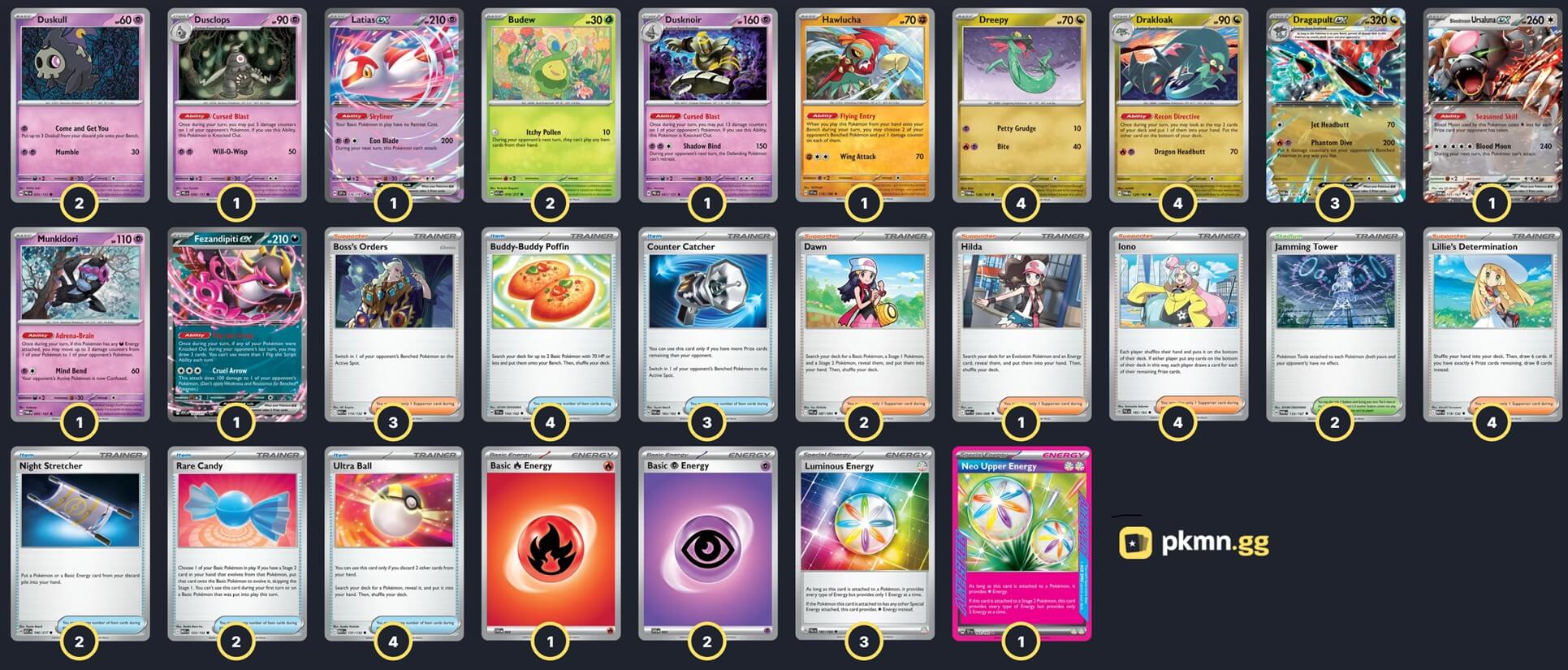 Pokémon: 22 4 Dreepy TWM 128 4 Drakloak TWM 129 3 Dragapult ex TWM 130 2 Duskull PRE 35 1 Dusclops PRE 36 1 Dusknoir PRE 37 2 Budew ASC 16 1 Latias ex SSP 76 1 Fezandipiti ex ASC 142 1 Bloodmoon Ursaluna ex TWM 141 1 Hawlucha SVI 118 1 Munkidori TWM 95 Trainer: 31 4 Iono PAL 185 4 Lillie's Determination MEG 119 3 Boss's Orders MEG 114 2 Dawn PFL 87 1 Hilda WHT 84 4 Buddy-Buddy Poffin TEF 144 4 Ultra Ball MEG 131 3 Counter Catcher PAR 160 2 Night Stretcher ASC 196 2 Rare Candy MEG 125 2 Jamming Tower TWM 153 Energy: 7 3 Luminous Energy PAL 191 2 Psychic Energy MEE 5 1 Fire Energy MEE 2 1 Neo Upper Energy TEF 162 |
