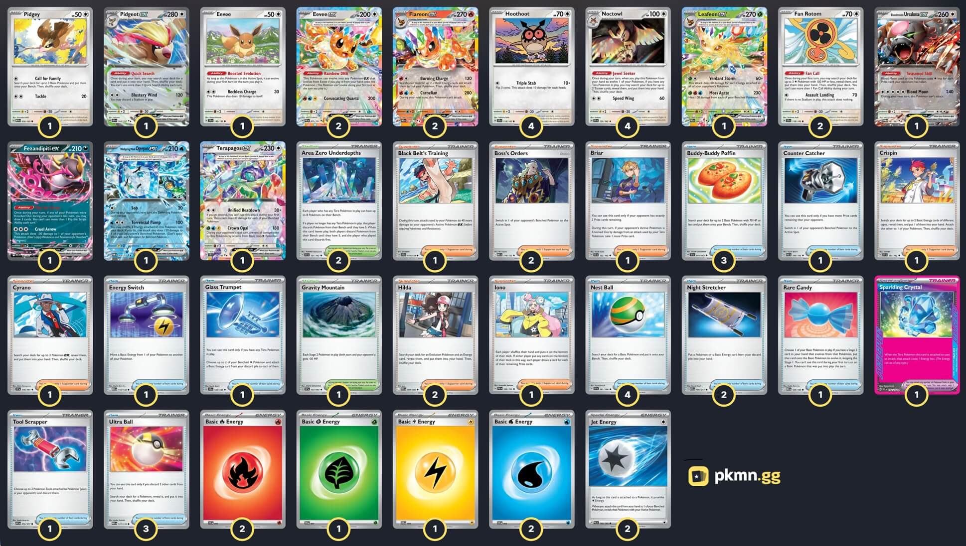 Pokémon: 22 4 Hoothoot SCR 114 4 Noctowl SCR 115 2 Eevee ex PRE 75 2 Fan Rotom SCR 118 1 Pidgey MEW 16 1 Pidgeot ex OBF 164 1 Eevee SSP 143 2 Flareon ex PRE 14 1 Leafeon ex PRE 6 1 Bloodmoon Ursaluna ex TWM 141 1 Terapagos ex SCR 128 1 Fezandipiti ex ASC 142 1 Wellspring Mask Ogerpon ex TWM 64 Trainer: 30 2 Boss's Orders MEG 114 2 Hilda WHT 84 1 Cyrano SSP 170 1 Black Belt's Training JTG 143 1 Iono PAL 185 1 Crispin SCR 133 1 Briar SCR 132 4 Nest Ball SVI 181 3 Buddy-Buddy Poffin TEF 144 3 Ultra Ball MEG 131 2 Night Stretcher ASC 196 1 Counter Catcher PAR 160 1 Tool Scrapper ASC 212 1 Rare Candy MEG 125 1 Glass Trumpet SCR 135 1 Energy Switch MEG 115 1 Sparkling Crystal SCR 142 2 Area Zero Underdepths SCR 131 1 Gravity Mountain SSP 177 Energy: 8 2 Fire Energy MEE 2 2 Jet Energy PAL 190 2 Water Energy MEE 3 1 Lightning Energy MEE 4 1 Grass Energy MEE 1 |