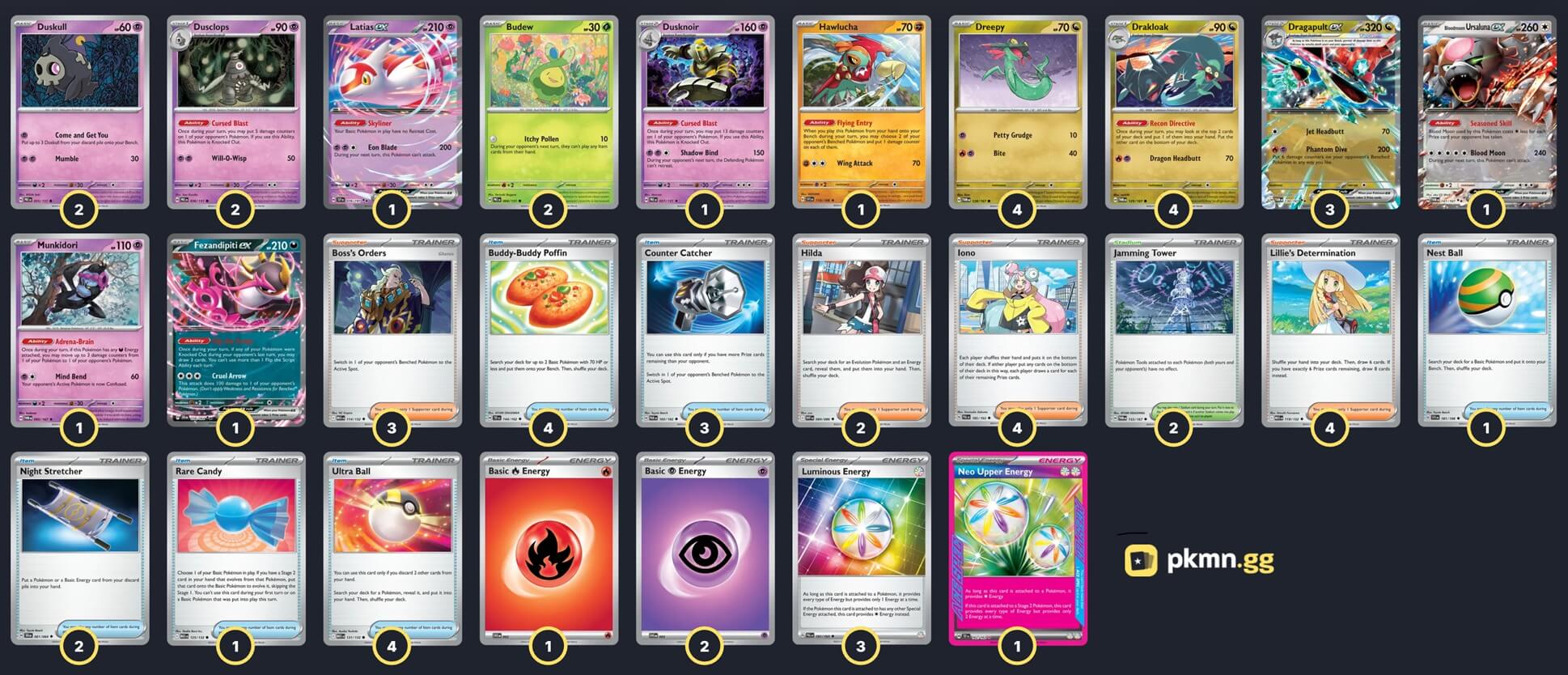 Pokémon: 23 4 Dreepy TWM 128 4 Drakloak TWM 129 3 Dragapult ex TWM 130 2 Duskull PRE 35 2 Dusclops PRE 36 1 Dusknoir PRE 37 2 Budew PRE 4 1 Latias ex SSP 76 1 Fezandipiti ex SFA 38 1 Bloodmoon Ursaluna ex TWM 141 1 Munkidori TWM 95 1 Hawlucha SVI 118 Trainer: 30 4 Lillie's Determination MEG 119 4 Iono PAL 185 3 Boss's Orders MEG 114 2 Hilda WHT 84 4 Ultra Ball MEG 131 4 Buddy-Buddy Poffin TEF 144 3 Counter Catcher PAR 160 2 Night Stretcher SFA 61 1 Nest Ball SVI 181 1 Rare Candy MEG 125 2 Jamming Tower TWM 153 Energy: 7 3 Luminous Energy PAL 191 2 Psychic Energy MEE 5 1 Fire Energy MEE 2 1 Neo Upper Energy TEF 162 |