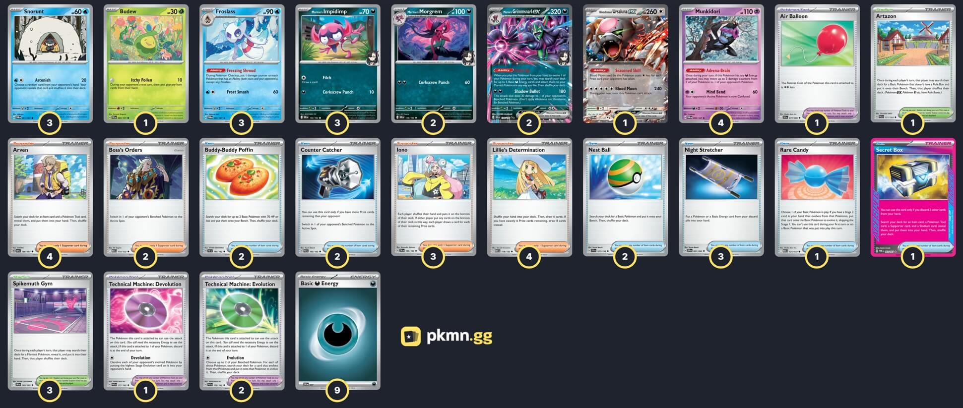 Pokémon: 19 4 Munkidori TWM 95 3 Marnie's Impidimp DRI 134 2 Marnie's Morgrem DRI 135 2 Marnie's Grimmsnarl ex DRI 136 3 Snorunt TWM 51 3 Froslass TWM 53 1 Budew PRE 4 1 Bloodmoon Ursaluna ex TWM 141 Trainer: 32 4 Arven OBF 186 4 Lillie's Determination MEG 119 3 Iono PAL 185 2 Boss's Orders MEG 114 3 Night Stretcher SFA 61 2 Nest Ball SVI 181 2 Counter Catcher PAR 160 2 Buddy-Buddy Poffin TEF 144 1 Rare Candy MEG 125 1 Secret Box TWM 163 2 Technical Machine: Evolution PAR 178 1 Air Balloon BLK 79 1 Technical Machine: Devolution PAR 177 3 Spikemuth Gym DRI 169 1 Artazon PAL 171 Energy: 9 9 Darkness Energy MEE 7 |