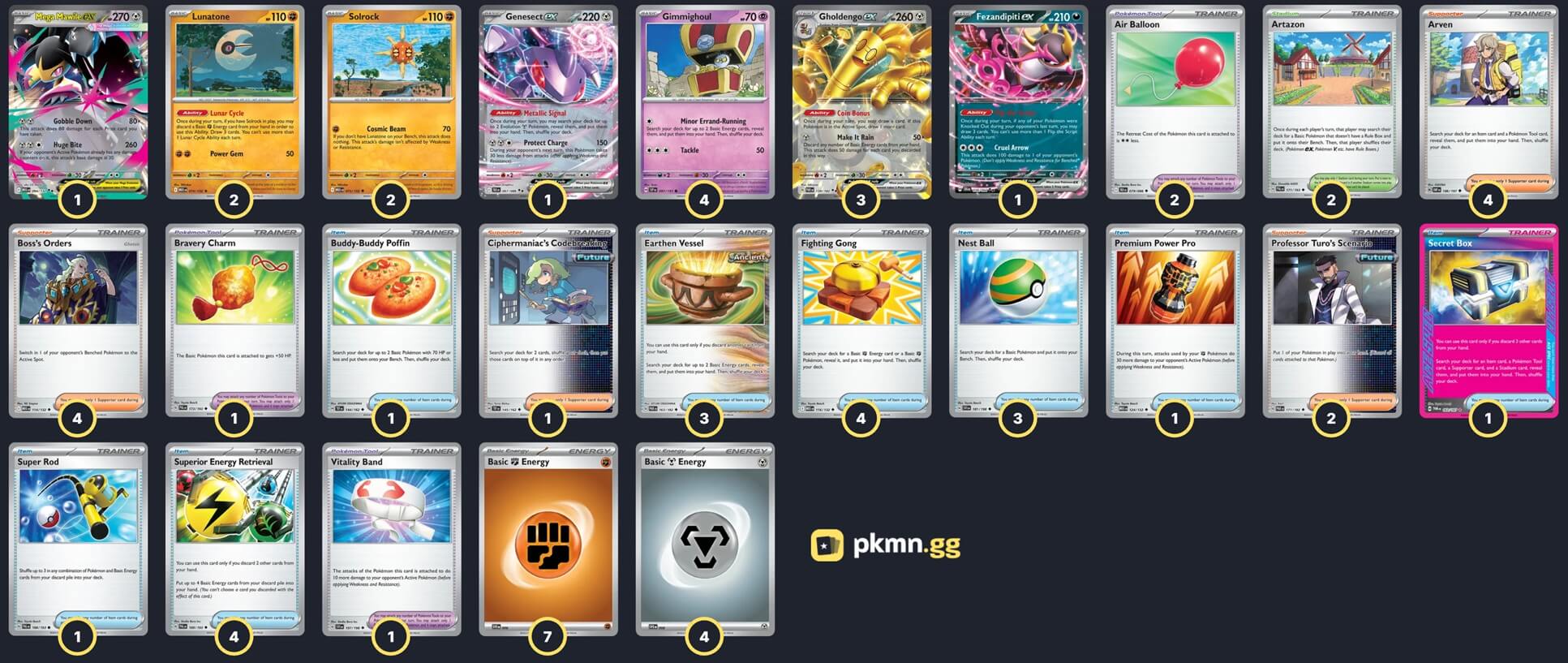 Pokémon: 14 4 Gimmighoul SSP 97 3 Gholdengo ex PAR 139 2 Solrock MEG 75 2 Lunatone MEG 74 1 Fezandipiti ex SFA 38 1 Genesect ex BLK 67 1 Mega Mawile ex MEG 94 Trainer: 35 4 Arven OBF 186 4 Boss's Orders MEG 114 2 Professor Turo's Scenario PAR 171 1 Ciphermaniac's Codebreaking TEF 145 4 Fighting Gong MEG 116 4 Superior Energy Retrieval PAL 189 3 Nest Ball SVI 181 3 Earthen Vessel PAR 163 1 Buddy-Buddy Poffin TEF 144 1 Super Rod PAL 188 1 Premium Power Pro MEG 124 1 Secret Box TWM 163 2 Air Balloon BLK 79 1 Vitality Band SVI 197 1 Bravery Charm PAL 173 2 Artazon PAL 171 Energy: 11 7 Fighting Energy MEE 6 4 Metal Energy MEE 8 |