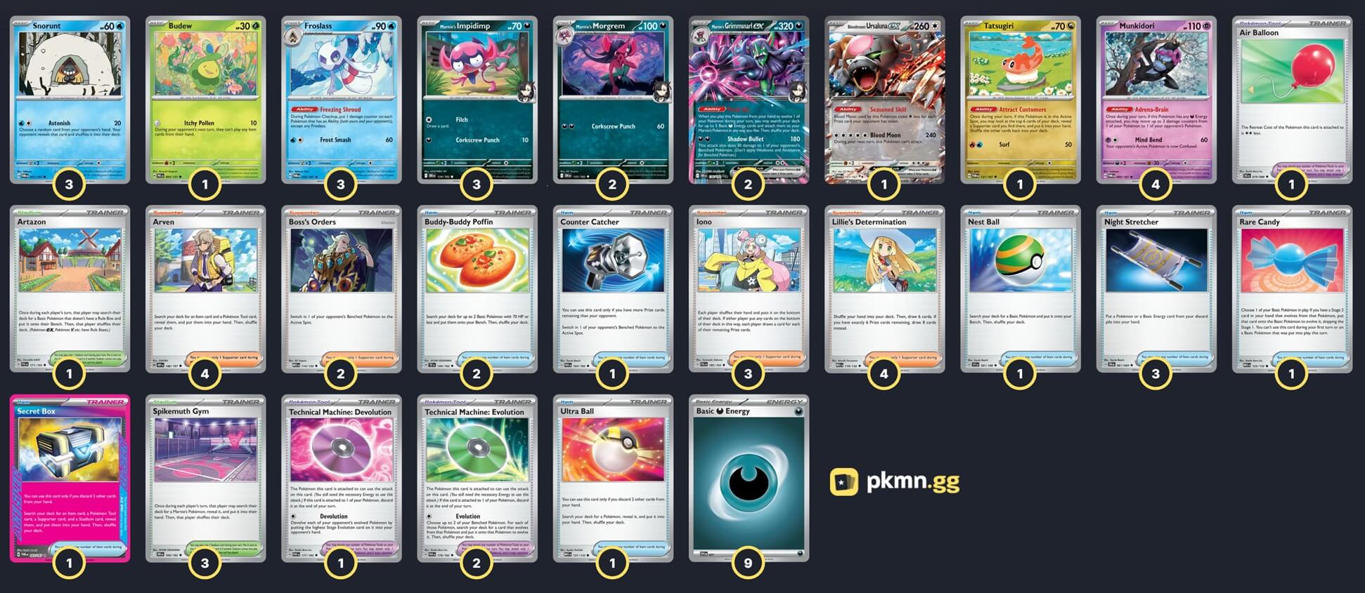 Pokémon: 20 4 Munkidori TWM 95 3 Marnie's Impidimp DRI 134 2 Marnie's Morgrem DRI 135 2 Marnie's Grimmsnarl ex DRI 136 3 Snorunt TWM 51 3 Froslass TWM 53 1 Tatsugiri TWM 131 1 Budew PRE 4 1 Bloodmoon Ursaluna ex TWM 141 Trainer: 31 4 Arven OBF 186 4 Lillie's Determination MEG 119 3 Iono PAL 185 2 Boss's Orders MEG 114 3 Night Stretcher SFA 61 2 Buddy-Buddy Poffin TEF 144 1 Counter Catcher PAR 160 1 Nest Ball SVI 181 1 Ultra Ball MEG 131 1 Secret Box TWM 163 1 Rare Candy MEG 125 2 Technical Machine: Evolution PAR 178 1 Air Balloon BLK 79 1 Technical Machine: Devolution PAR 177 3 Spikemuth Gym DRI 169 1 Artazon PAL 171 Energy: 9 9 Darkness Energy MEE 7 |