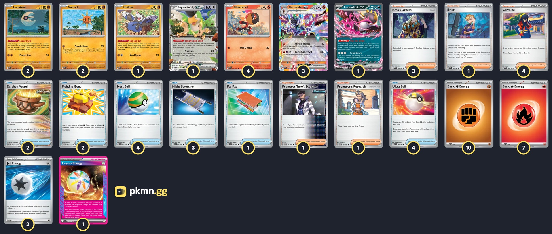 Pokémon: 14 4 Charcadet SSP 32 3 Ceruledge ex SSP 36 2 Lunatone MEG 74 2 Solrock MEG 75 1 Squawkabilly ex PAL 169 1 Fezandipiti ex SFA 38 1 Drilbur TEF 85 Trainer: 26 4 Carmine TWM 145 3 Boss's Orders MEG 114 1 Professor's Research JTG 155 1 Briar SCR 132 1 Professor Turo's Scenario PAR 171 4 Nest Ball SVI 181 4 Ultra Ball MEG 131 3 Night Stretcher SFA 61 2 Fighting Gong MEG 116 2 Earthen Vessel PAR 163 1 Pal Pad SVI 182 Energy: 20 10 Fighting Energy SVE 22 7 Fire Energy SVE 18 2 Jet Energy PAL 190 1 Legacy Energy TWM 167 | |