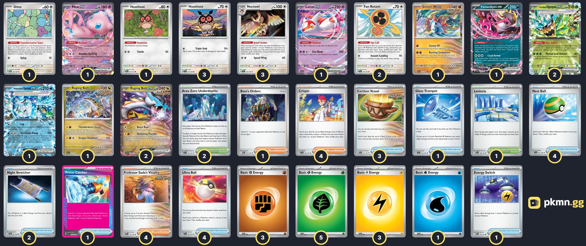 Pokémon: 20 3 Hoothoot SCR 114 1 Hoothoot PRE 77 3 Noctowl SCR 115 2 Raging Bolt ex TEF 123 2 Fan Rotom SCR 118 2 Teal Mask Ogerpon ex TWM 25 1 Fezandipiti ex SFA 38 1 Mew ex MEW 151 1 Ditto MEW 132 1 Latias ex SSP 76 1 Slither Wing PAR 107 1 Wellspring Mask Ogerpon ex TWM 64 1 Raging Bolt SCR 111 Trainer: 28 4 Professor Sada's Vitality PAR 170 4 Crispin SCR 133 1 Boss's Orders MEG 114 4 Nest Ball SVI 181 4 Ultra Ball MEG 131 3 Earthen Vessel PAR 163 2 Night Stretcher SFA 61 1 Glass Trumpet SCR 135 1 Prime Catcher TEF 157 1 Energy Switch MEG 115 2 Area Zero Underdepths SCR 131 1 Levincia JTG 150 Energy: 12 5 Grass Energy SVE 17 3 Lightning Energy SVE 20 3 Fighting Energy SVE 22 1 Water Energy SVE 19 | |