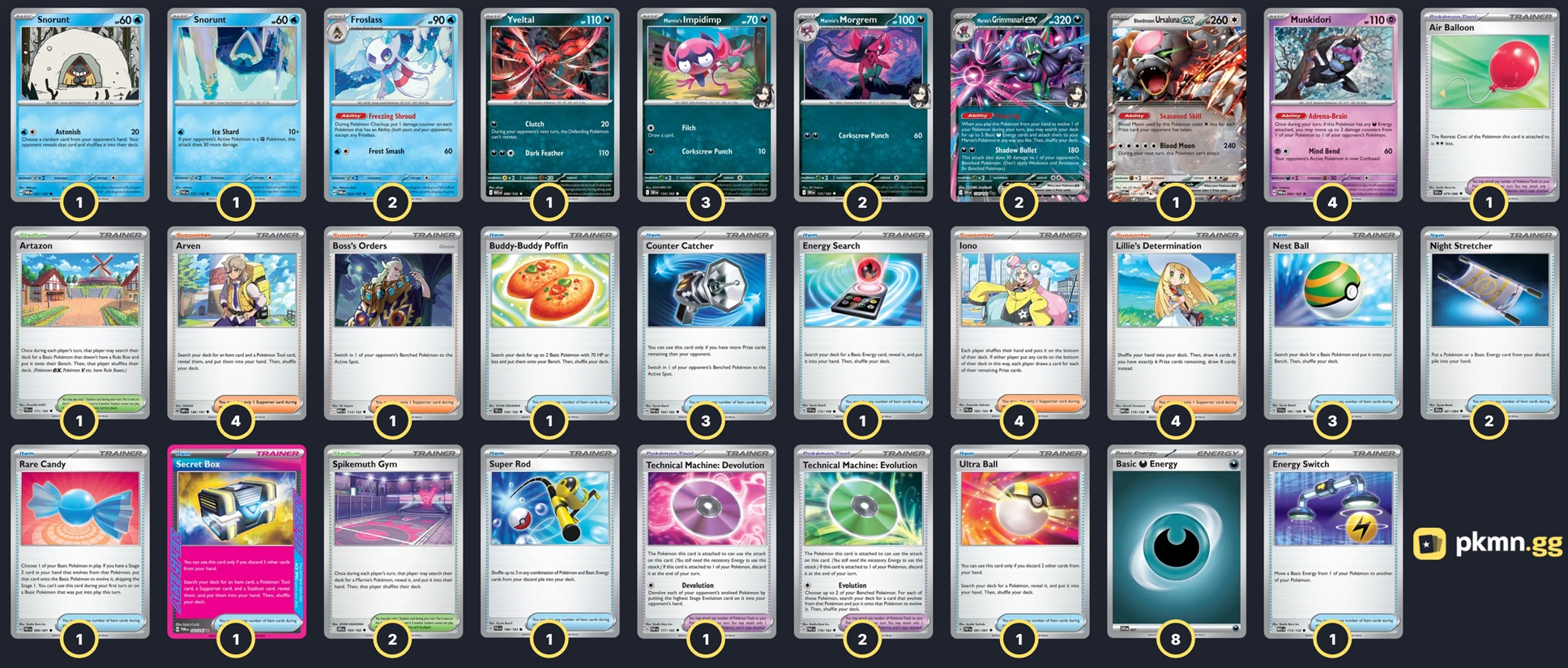 Pokémon: 17 4 Munkidori TWM 95 3 Marnie's Impidimp DRI 134 2 Marnie's Morgrem DRI 135 2 Marnie's Grimmsnarl ex DRI 136 1 Snorunt PAR 37 1 Snorunt TWM 51 2 Froslass TWM 53 1 Yveltal MEG 88 1 Bloodmoon Ursaluna ex TWM 141 Trainer: 35 4 Lillie's Determination MEG 119 4 Arven OBF 186 4 Iono PAL 185 1 Boss's Orders MEG 114 3 Counter Catcher PAR 160 3 Nest Ball SVI 181 2 Night Stretcher SFA 61 1 Ultra Ball MEG 131 1 Buddy-Buddy Poffin TEF 144 1 Rare Candy MEG 125 1 Super Rod PAL 188 1 Energy Switch MEG 115 1 Energy Search SVI 172 1 Secret Box TWM 163 2 Technical Machine: Evolution PAR 178 1 Technical Machine: Devolution PAR 177 1 Air Balloon BLK 79 2 Spikemuth Gym DRI 169 1 Artazon PAL 171 Energy: 8 8 Darkness Energy SVE 23 | |