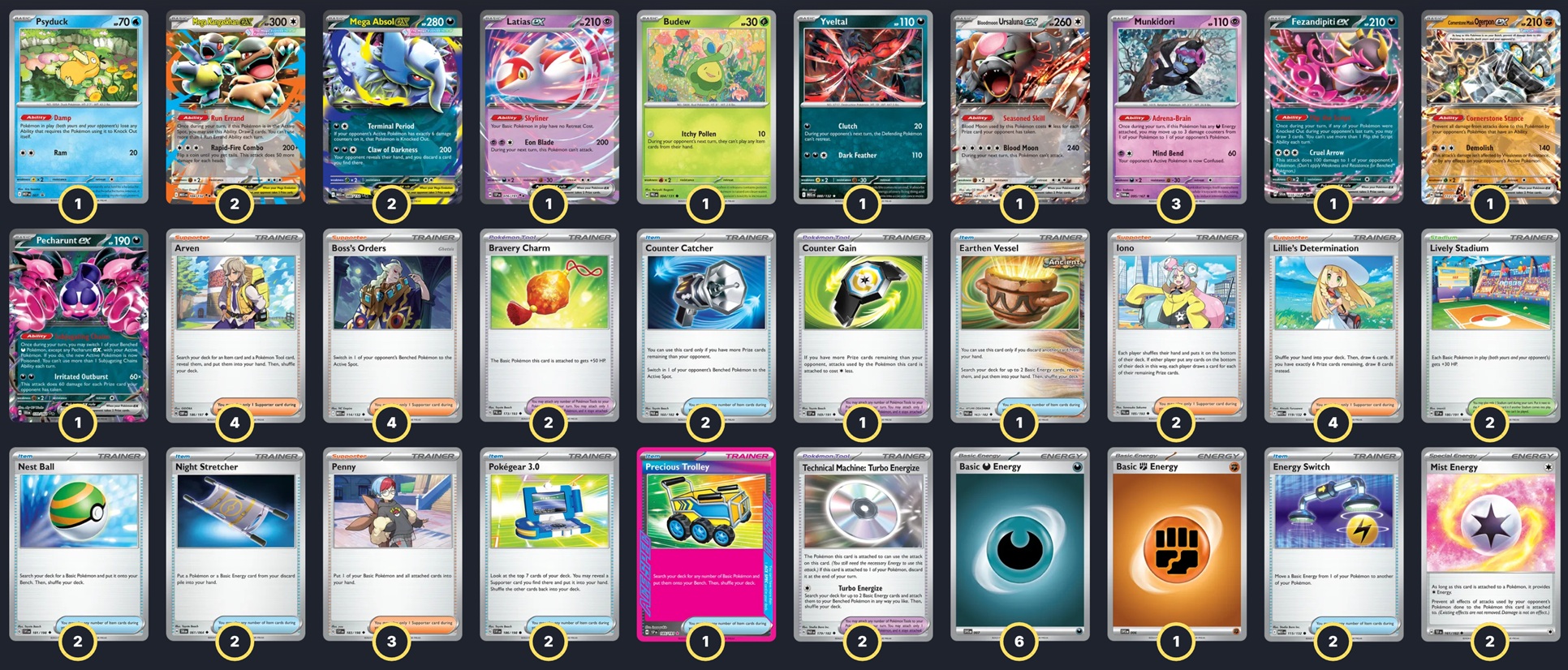 Pokémon: 15 3 Munkidori TWM 95 2 Mega Kangaskhan ex MEG 104 2 Mega Absol ex MEG 86 1 Budew PRE 4 1 Bloodmoon Ursaluna ex TWM 141 1 Yveltal MEG 88 1 Psyduck MEP 7 1 Cornerstone Mask Ogerpon ex TWM 112 1 Fezandipiti ex SFA 38 1 Pecharunt ex SFA 39 1 Latias ex SSP 76 Trainer: 36 4 Arven OBF 186 4 Boss's Orders MEG 114 4 Lillie's Determination MEG 119 3 Penny SVI 183 2 Iono PAL 185 2 Energy Switch MEG 115 2 Night Stretcher SFA 61 2 Pokégear 3.0 SVI 186 2 Nest Ball SVI 181 2 Counter Catcher PAR 160 1 Precious Trolley SSP 185 1 Earthen Vessel PAR 163 2 Bravery Charm PAL 173 2 Technical Machine: Turbo Energize PAR 179 1 Counter Gain SSP 169 2 Lively Stadium SSP 180 Energy: 9 6 Darkness Energy SVE 23 2 Mist Energy TEF 161 1 Fighting Energy SVE 22 | |