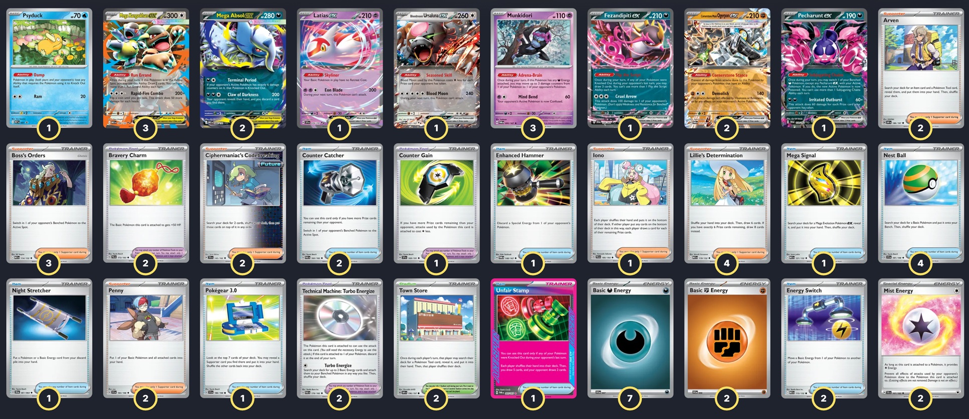 Pokémon: 15 3 Munkidori TWM 95 3 Mega Kangaskhan ex MEG 104 2 Mega Absol ex MEG 86 2 Cornerstone Mask Ogerpon ex TWM 112 1 Pecharunt ex SFA 39 1 Latias ex SSP 76 1 Fezandipiti ex SFA 38 1 Bloodmoon Ursaluna ex TWM 141 1 Psyduck MEP 7 Trainer: 34 4 Lillie's Determination MEG 119 3 Boss's Orders MEG 114 2 Ciphermaniac's Codebreaking TEF 145 2 Penny SVI 183 2 Arven OBF 186 1 Iono PAL 185 4 Nest Ball SVI 181 2 Energy Switch MEG 115 2 Counter Catcher PAR 160 1 Unfair Stamp TWM 165 1 Pokégear 3.0 SVI 186 1 Mega Signal MEG 121 1 Night Stretcher SFA 61 1 Enhanced Hammer TWM 148 2 Technical Machine: Turbo Energize PAR 179 2 Bravery Charm PAL 173 1 Counter Gain SSP 169 2 Town Store OBF 196 Energy: 11 7 Darkness Energy SVE 23 2 Mist Energy TEF 161 2 Fighting Energy SVE 22 |