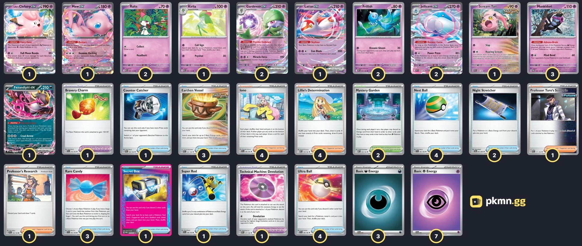 Pokémon: 17 3 Munkidori TWM 95 2 Ralts MEG 58 1 Kirlia MEG 59 2 Gardevoir ex SVI 86 2 Frillish WHT 44 2 Jellicent ex WHT 45 1 Lillie's Clefairy ex JTG 56 1 Latias ex SSP 76 1 Mew ex MEW 151 1 Fezandipiti ex SFA 38 1 Scream Tail PAR 86 Trainer: 33 4 Iono PAL 185 4 Lillie's Determination MEG 119 1 Professor's Research JTG 155 1 Professor Turo's Scenario PAR 171 4 Nest Ball SVI 181 4 Ultra Ball MEG 131 3 Rare Candy MEG 125 3 Earthen Vessel PAR 163 2 Night Stretcher SFA 61 1 Secret Box TWM 163 1 Super Rod PAL 188 1 Counter Catcher PAR 160 1 Bravery Charm PAL 173 1 Technical Machine: Devolution PAR 177 2 Mystery Garden MEG 122 Energy: 10 7 Psychic Energy SVE 21 3 Darkness Energy SVE 23 |