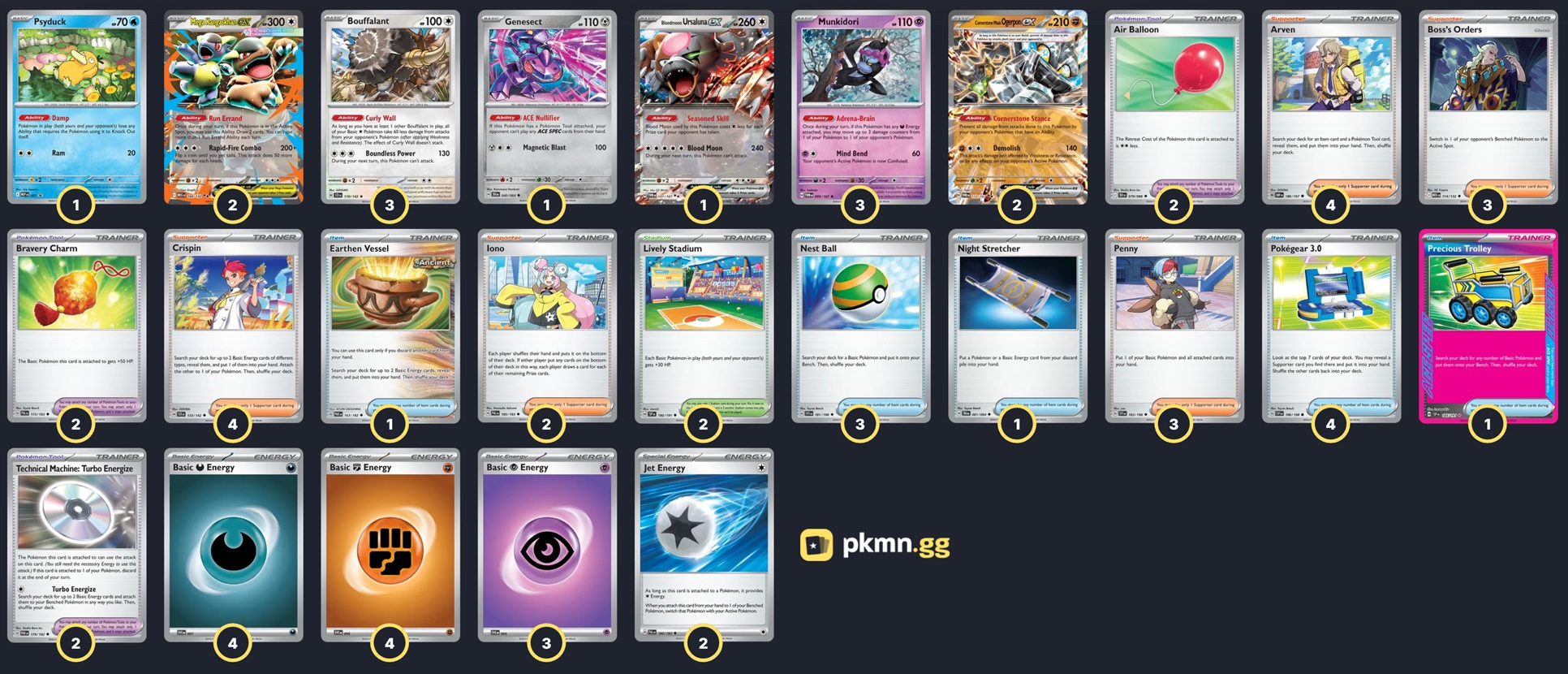 Pokémon: 16 3 Ralts MEG 58 2 Kirlia MEG 59 2 Gardevoir ex SVI 86 3 Munkidori TWM 95 1 Drifloon SVI 89 1 Mew ex MEW 151 1 Fezandipiti ex SFA 38 1 Flutter Mane TEF 78 1 Scream Tail PAR 86 1 Lillie's Clefairy ex JTG 56 Trainer: 34 4 Iono PAL 185 3 Lillie's Determination MEG 119 2 Arven OBF 186 2 Professor's Research JTG 155 4 Earthen Vessel PAR 163 4 Ultra Ball MEG 131 2 Night Stretcher SFA 61 2 Rare Candy MEG 125 2 Nest Ball SVI 181 1 Super Rod PAL 188 1 Secret Box TWM 163 1 Counter Catcher PAR 160 3 Bravery Charm PAL 173 1 Technical Machine: Evolution PAR 178 2 Artazon PAL 171 Energy: 10 7 Psychic Energy SVE 21 3 Darkness Energy SVE 23 |