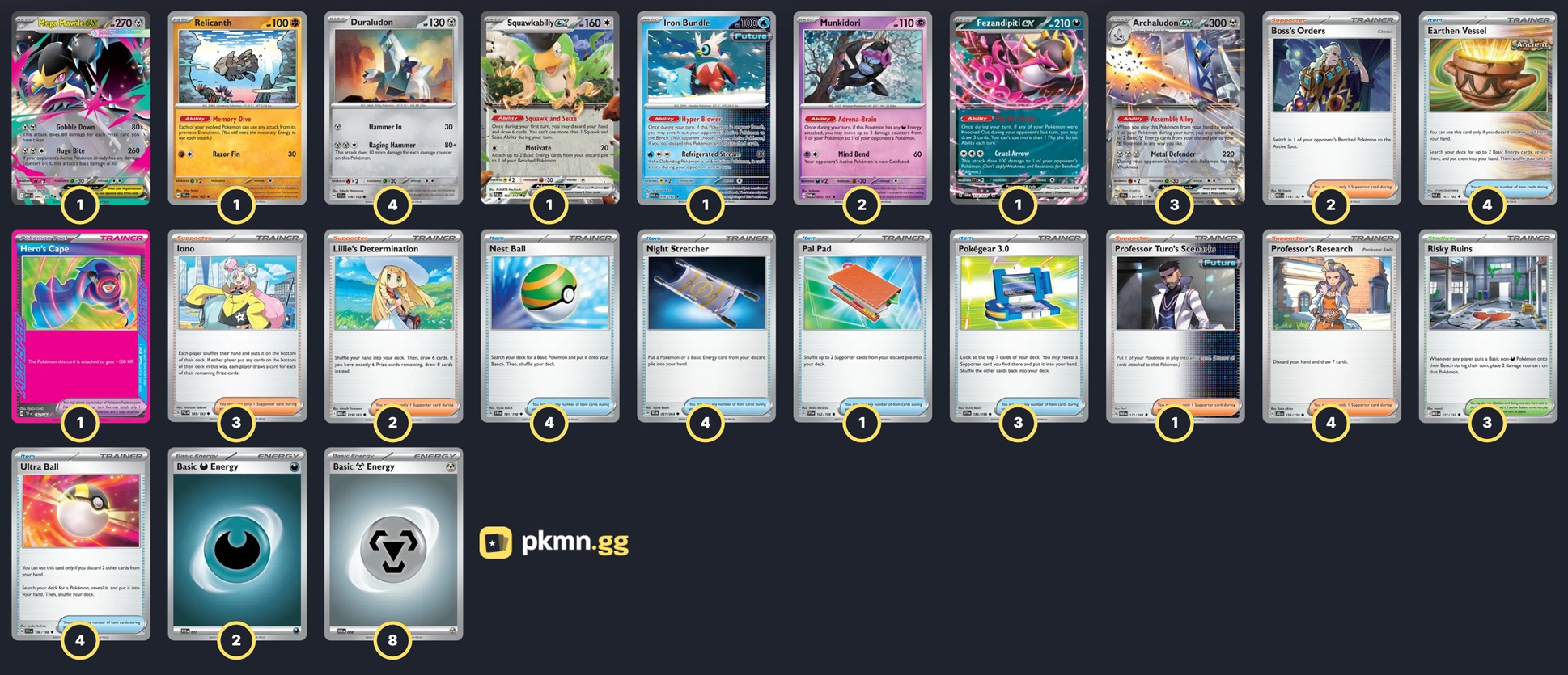 Pokémon: 14 4 Duraludon SCR 106 3 Archaludon ex SSP 130 2 Munkidori TWM 95 1 Mega Mawile ex MEG 94 1 Squawkabilly ex PAL 169 1 Fezandipiti ex SFA 38 1 Iron Bundle PAR 56 1 Relicanth TEF 84 Trainer: 36 4 Professor's Research JTG 155 3 Iono PAL 185 2 Lillie's Determination MEG 119 2 Boss's Orders MEG 114 1 Professor Turo's Scenario PAR 171 4 Earthen Vessel PAR 163 4 Ultra Ball MEG 131 4 Nest Ball SVI 181 4 Night Stretcher SFA 61 3 Pokégear 3.0 SVI 186 1 Pal Pad SVI 182 1 Hero's Cape TEF 152 3 Risky Ruins MEG 127 Energy: 10 8 Metal Energy SVE 24 2 Darkness Energy SVE 23 | |