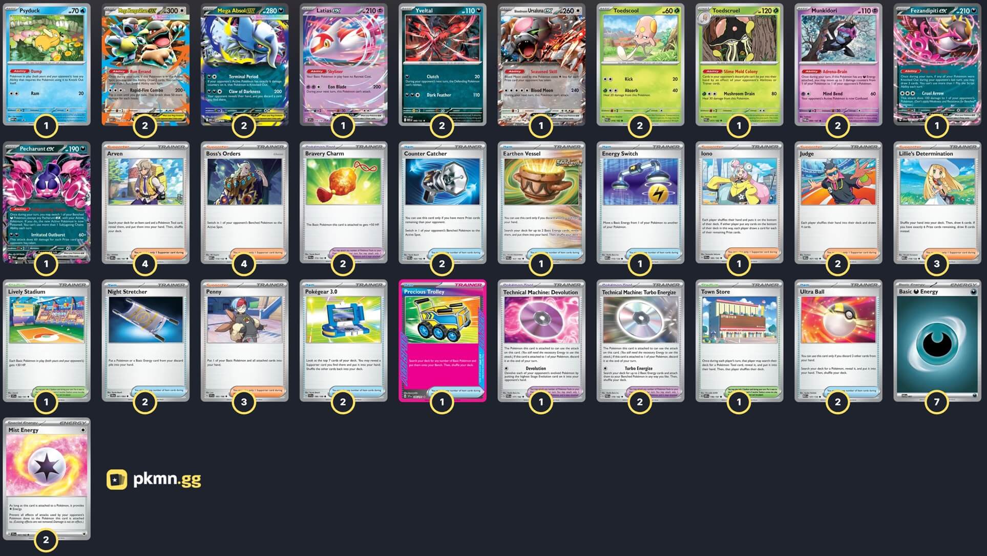 Pokémon: 16 2 Toedscool PAR 16 1 Toedscruel PAR 17 2 Mega Kangaskhan ex MEG 104 2 Yveltal MEG 88 2 Mega Absol ex MEG 86 2 Munkidori TWM 95 1 Bloodmoon Ursaluna ex TWM 141 1 Pecharunt ex SFA 39 1 Fezandipiti ex SFA 38 1 Latias ex SSP 76 1 Psyduck MEP 7 Trainer: 35 4 Boss's Orders MEG 114 4 Arven OBF 186 3 Penny SVI 183 3 Lillie's Determination MEG 119 2 Judge DRI 167 1 Iono PAL 185 2 Ultra Ball MEG 131 2 Pokégear 3.0 SVI 186 2 Night Stretcher SFA 61 2 Counter Catcher PAR 160 1 Precious Trolley SSP 185 1 Energy Switch MEG 115 1 Earthen Vessel PAR 163 2 Technical Machine: Turbo Energize PAR 179 2 Bravery Charm PAL 173 1 Technical Machine: Devolution PAR 177 1 Town Store OBF 196 1 Lively Stadium SSP 180 Energy: 9 7 Darkness Energy MEE 7 2 Mist Energy TEF 161 |