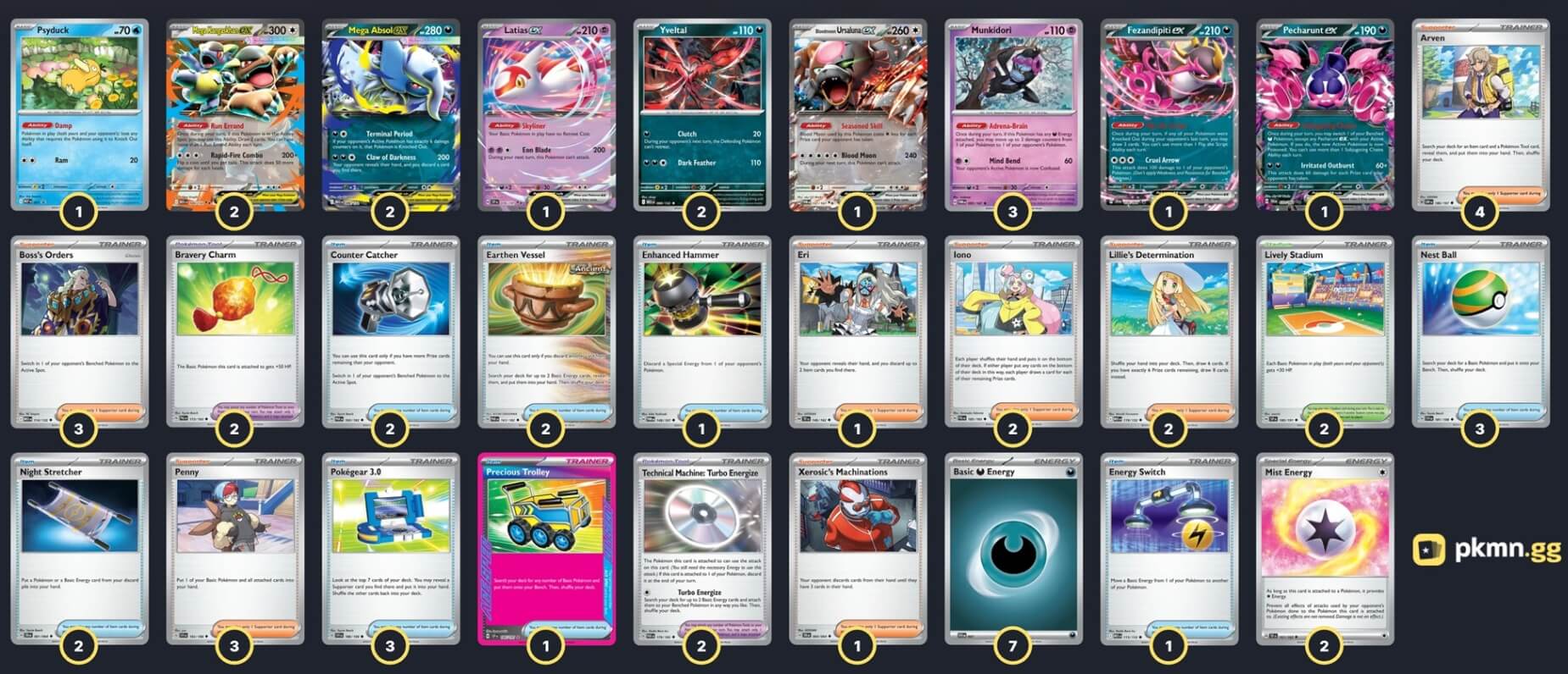 Pokémon: 14 3 Munkidori TWM 95 2 Mega Absol ex MEG 86 2 Mega Kangaskhan ex MEG 104 2 Yveltal MEG 88 1 Psyduck MEP 7 1 Bloodmoon Ursaluna ex TWM 141 1 Pecharunt ex SFA 39 1 Fezandipiti ex SFA 38 1 Latias ex SSP 76 Trainer: 37 4 Arven OBF 186 3 Penny SVI 183 3 Boss's Orders MEG 114 2 Iono PAL 185 2 Lillie's Determination MEG 119 1 Eri TEF 146 1 Xerosic's Machinations SFA 64 3 Pokégear 3.0 SVI 186 3 Nest Ball SVI 181 2 Counter Catcher PAR 160 2 Night Stretcher SFA 61 2 Earthen Vessel PAR 163 1 Energy Switch MEG 115 1 Enhanced Hammer TWM 148 1 Precious Trolley SSP 185 2 Technical Machine: Turbo Energize PAR 179 2 Bravery Charm PAL 173 2 Lively Stadium SSP 180 Energy: 9 7 Darkness Energy SVE 23 2 Mist Energy TEF 161 |