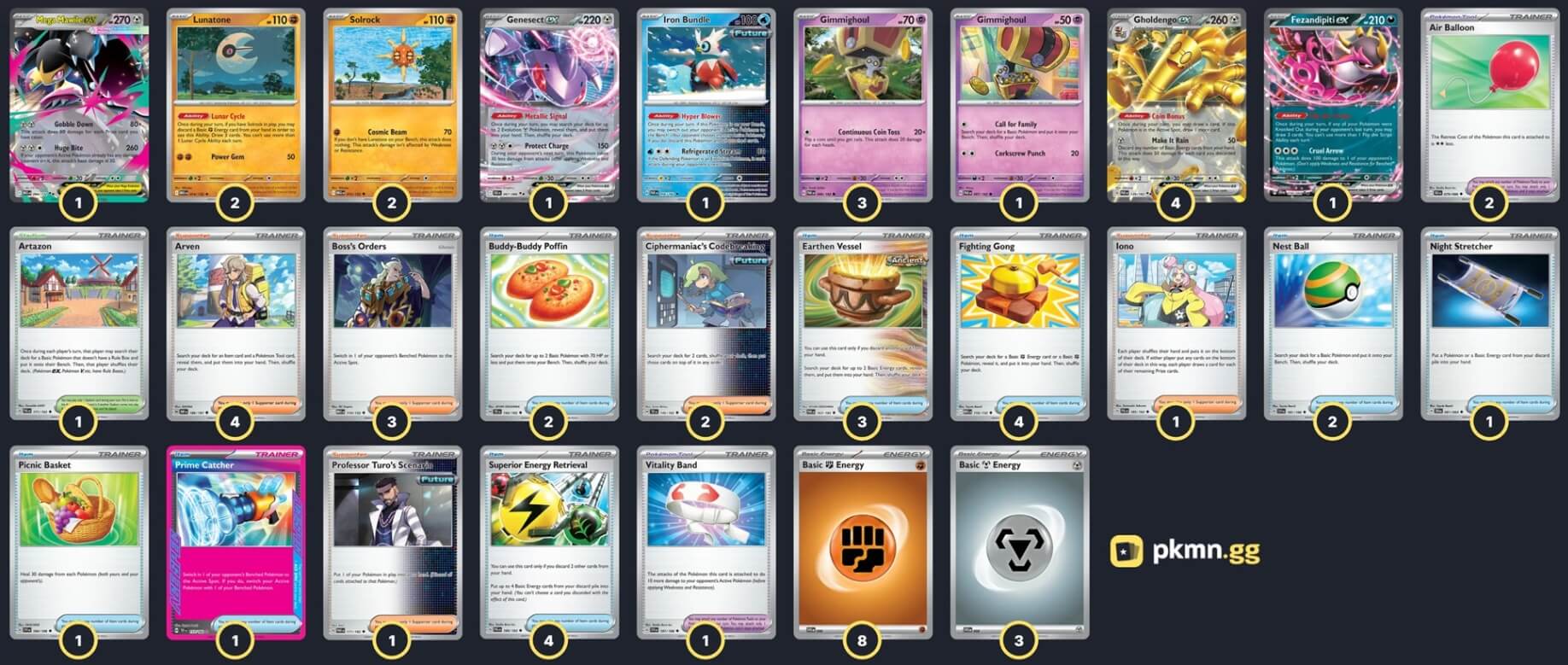 Pokémon: 16 3 Gimmighoul PAR 88 1 Gimmighoul PAR 87 4 Gholdengo ex PAR 139 2 Lunatone MEG 74 2 Solrock MEG 75 1 Genesect ex BLK 67 1 Mega Mawile ex MEG 94 1 Fezandipiti ex SFA 38 1 Iron Bundle PAR 56 Trainer: 33 4 Arven OBF 186 3 Boss's Orders MEG 114 2 Ciphermaniac's Codebreaking TEF 145 1 Iono PAL 185 1 Professor Turo's Scenario PAR 171 4 Fighting Gong MEG 116 4 Superior Energy Retrieval PAL 189 3 Earthen Vessel PAR 163 2 Nest Ball SVI 181 2 Buddy-Buddy Poffin TEF 144 1 Picnic Basket SVI 184 1 Prime Catcher TEF 157 1 Night Stretcher SFA 61 2 Air Balloon BLK 79 1 Vitality Band SVI 197 1 Artazon PAL 171 Energy: 11 8 Fighting Energy SVE 22 3 Metal Energy SVE 24 |
