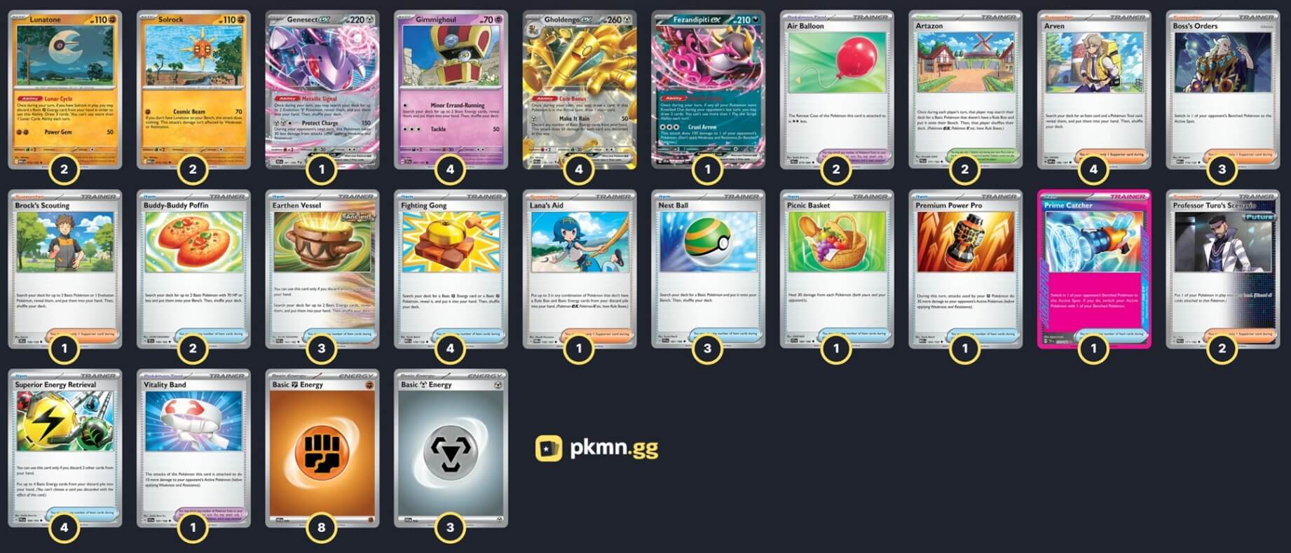 Pokémon: 14 4 Gimmighoul SSP 97 4 Gholdengo ex PAR 139 2 Solrock MEG 75 2 Lunatone MEG 74 1 Fezandipiti ex SFA 38 1 Genesect ex BLK 67 Trainer: 35 4 Arven OBF 186 3 Boss's Orders MEG 114 2 Professor Turo's Scenario PAR 171 1 Lana's Aid TWM 155 1 Brock's Scouting JTG 146 4 Fighting Gong MEG 116 4 Superior Energy Retrieval PAL 189 3 Earthen Vessel PAR 163 3 Nest Ball SVI 181 2 Buddy-Buddy Poffin TEF 144 1 Picnic Basket SVI 184 1 Premium Power Pro MEG 124 1 Prime Catcher TEF 157 2 Air Balloon BLK 79 1 Vitality Band SVI 197 2 Artazon PAL 171 Energy: 11 8 Fighting Energy SVE 22 3 Metal Energy SVE 24 |