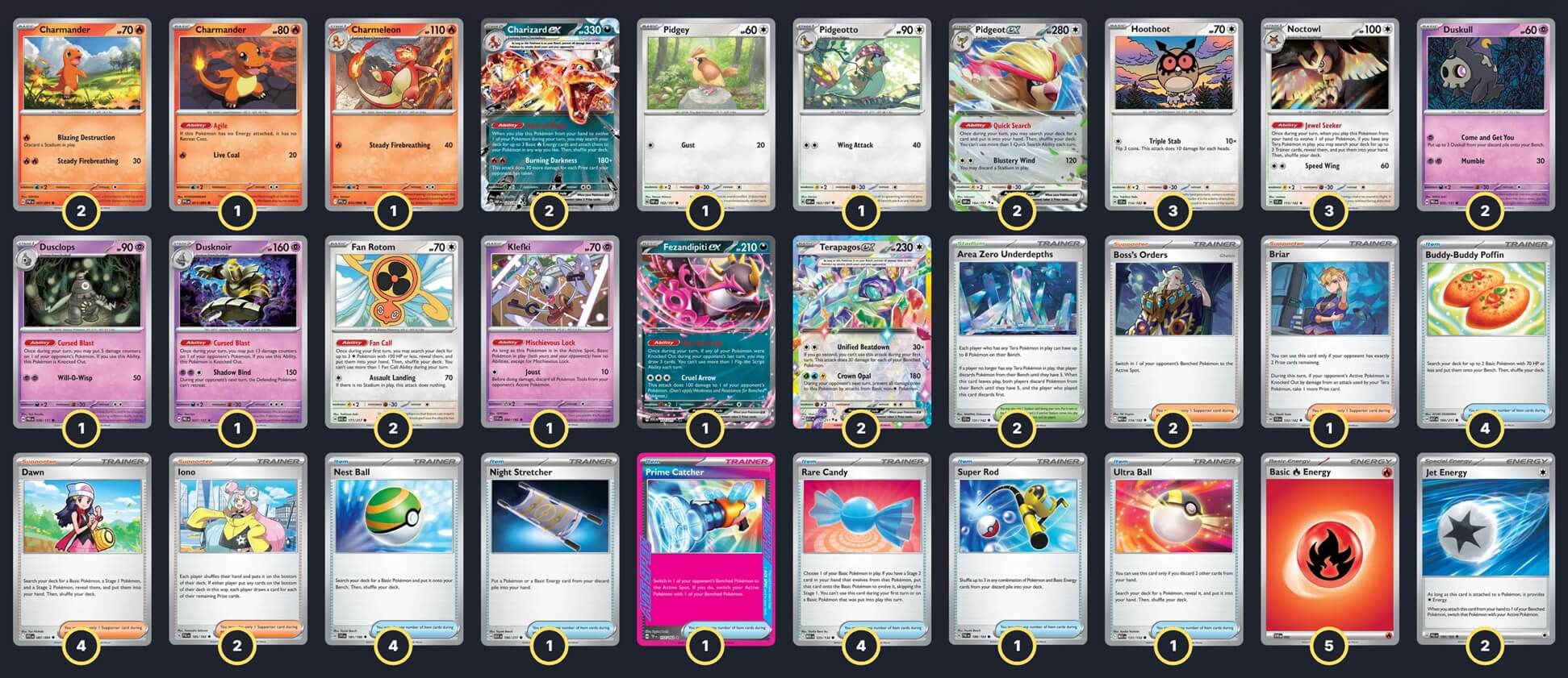 Pokémon: 26 3 Hoothoot SCR 114 3 Noctowl SCR 115 2 Charmander PAF 7 1 Charmander PFL 11 1 Charmeleon PFL 12 2 Charizard ex OBF 125 2 Duskull PRE 35 1 Dusclops PRE 36 1 Dusknoir PRE 37 2 Fan Rotom ASC 171 2 Terapagos ex ASC 179 1 Pidgey OBF 162 1 Pidgeotto OBF 163 2 Pidgeot ex OBF 164 1 Fezandipiti ex ASC 142 1 Klefki SVI 96 Trainer: 27 4 Dawn PFL 87 2 Iono PAL 185 2 Boss's Orders MEG 114 1 Briar SCR 132 4 Nest Ball SVI 181 4 Buddy-Buddy Poffin ASC 184 4 Rare Candy MEG 125 1 Ultra Ball MEG 131 1 Super Rod PAL 188 1 Night Stretcher ASC 196 1 Prime Catcher TEF 157 2 Area Zero Underdepths SCR 131 Energy: 7 5 Fire Energy MEE 2 2 Jet Energy PAL 190 |