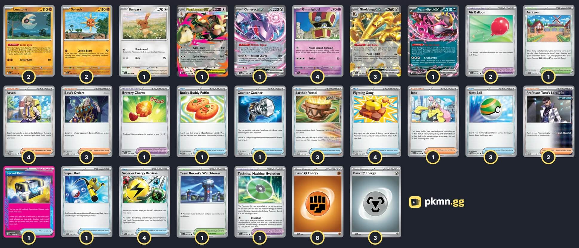 Pokémon: 15 4 Gimmighoul SSP 97 3 Gholdengo ex PAR 139 2 Solrock MEG 75 2 Lunatone MEG 74 1 Buneary PFL 83 1 Mega Lopunny ex PFL 84 1 Genesect ex BLK 67 1 Fezandipiti ex ASC 142 Trainer: 34 4 Arven OBF 186 3 Boss's Orders MEG 114 2 Professor Turo's Scenario PAR 171 1 Iono PAL 185 4 Fighting Gong MEG 116 4 Superior Energy Retrieval PAL 189 3 Nest Ball SVI 181 3 Earthen Vessel PAR 163 1 Secret Box TWM 163 1 Buddy-Buddy Poffin TEF 144 1 Counter Catcher PAR 160 1 Super Rod PAL 188 2 Air Balloon ASC 181 1 Bravery Charm PAL 173 1 Technical Machine: Evolution PAR 178 1 Artazon PAL 171 1 Team Rocket's Watchtower DRI 180 Energy: 11 8 Fighting Energy MEE 6 3 Metal Energy MEE 8 |